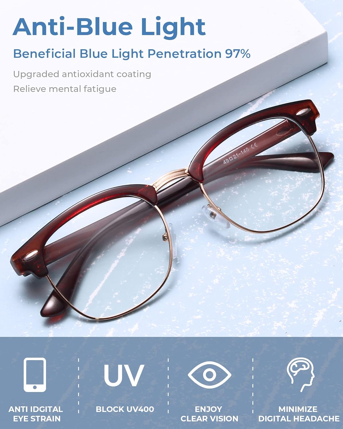 Review: Updated Review – December 2024While the styling, blue light feature, and price are great, I experienced durability issues. Both pairs I purchased broke over Christmas, just a month after my original review. They snapped at the left temple near the hinge, despite normal handling.Unless I’m able to get them exchanged, I don’t plan to repurchase due to the product’s quality concerns.Original Review: November 2024Bought this several months ago and I’m very happy with these reading glasses! The styling is fantastic—retro and semi-rimless, with a modern twist. I have received numerous compliments on their look and design. My favorite is the clear frame.The quality of the construction is top-notch. The lenses are clear, scratch-resistant, and provide great magnification. I also appreciate the ergonomic design with the silicone nose pads—very comfortable and lightweight, so no pressure on my nose during long reading sessions. The other thing I love is that the temple arms are long enough to go over my ears… which has been a challenge for me in adulthood. I normally have to request longer temple arms.What really surprised me was discovering the blue light blocking functionality. I didn’t realize these glasses had that feature until I received them, but it’s a game-changer! I spend a lot of time on screens, and I’ve noticed less eye strain and fewer headaches since using these. I sleep better, too, since the blue light blocking reduces eye fatigue from digital devices.For the price, you get 3 pairs of glasses, each in its own PU leather case, so you can keep them wherever you read. I think these are a great value for anyone looking for stylish, functional reading glasses that also offer extra protection against digital strain.Would definitely buy again and highly recommend to anyone in the market for new readers!