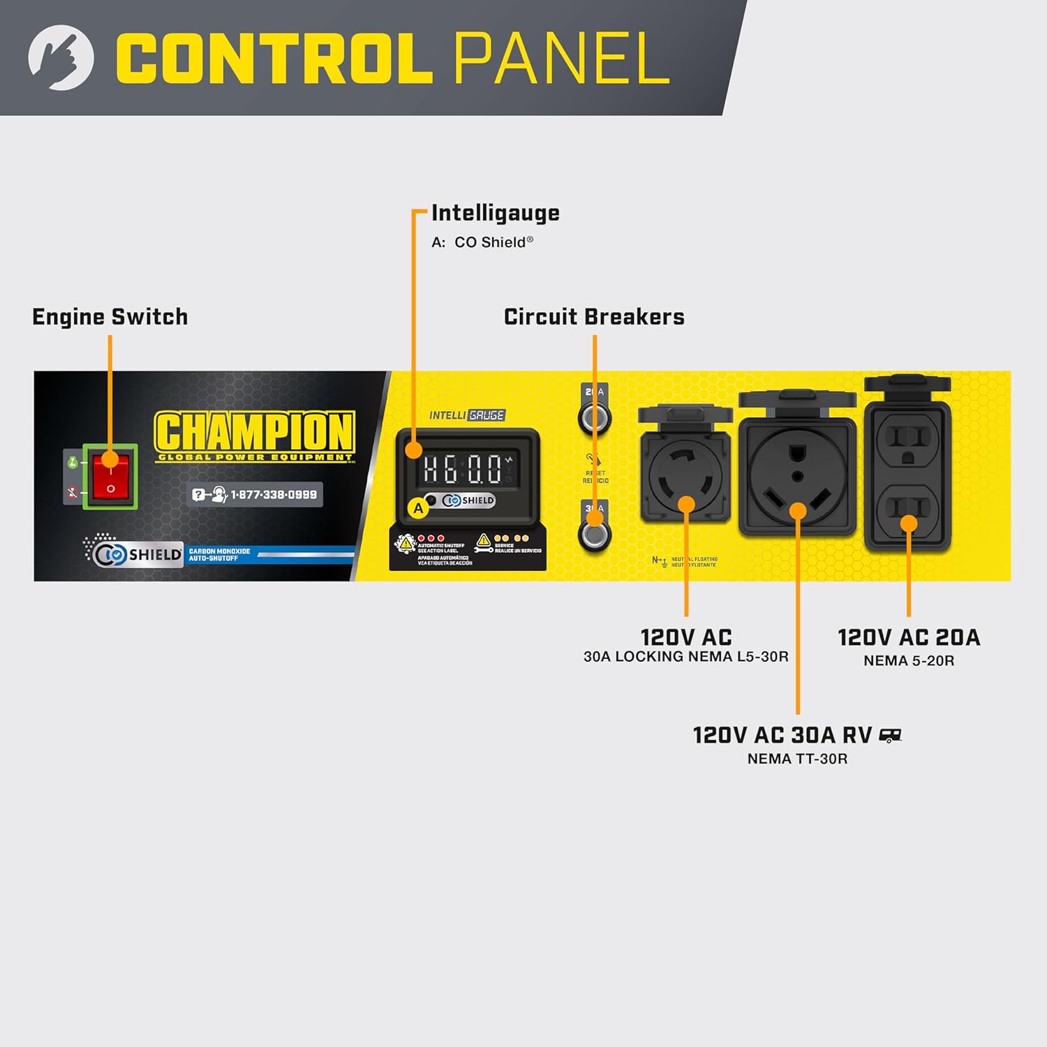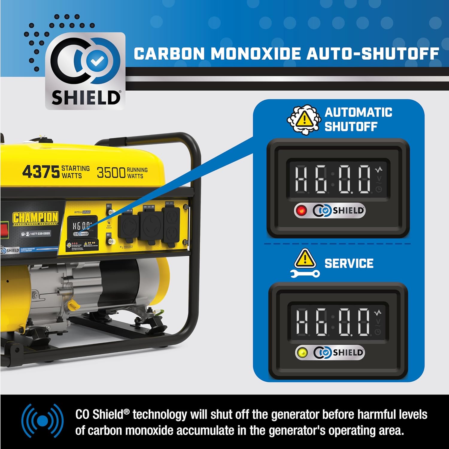 The Champion Power Equipment 201286 3500-Watt RV Ready Portable Generator with CO Shield® is the perfect combination of versatility and convenience. A powerful companion for your next camping trip or weekend project, this generator can also provide plenty of backup power for your essentials during an outage. For your RV, you’ll enjoy enough power to start and run a 15,000 BTU RV air conditioner. Power up with Champion’s reliable recoil start, plus Cold Start Technology ensures a quick start in cold weather. Champion also makes it easy to monitor voltage, frequency and operating hours with Intelligauge. Designed for safety with convenient push-to-reset circuit breakers, a low oil shut-off switch plus an included oil funnel for easy changes, this unit has a 0.6-quart oil capacity (recommended 10W-30). The reliable 212cc single-cylinder OHV Champion engine produces 4375 starting watts and 3500 running watts, and will run for up to 12 hours at 50% load when the 4.7-gallon tank of gasoline is full. With a noise level of 68 dBA from 23 feet, which is about as loud as a vacuum cleaner, this machine can handle most essentials in an outage, plus the Volt Guard™ built-in surge protector prevents overloads and keeps your equipment safe from spikes in voltage. All the outlets have covers for protection and include a 120V 30A (TT-30R) RV outlet as well as a 120V 30A locking outlet (L5-30R) and a 120V 20A household duplex outlet (5-20R). Champion’s thoughtful packaging and clear directions make setup hassle free. Buy this EPA certified generator with confidence – Champion Support and our nationwide network of service centers will back up your purchase with a 3-year limited warranty and FREE lifetime technical support. CO Shield® technology monitors the accumulation of carbon monoxide (CO), a poisonous gas produced by engine exhaust when the generator is running. If CO Shield® detects unsafe elevated levels of CO gas, it automatically shuts off the engine. CO Shield® is not a substitute for an indoor carbon monoxide alarm or for safe operation. DO NOT allow engine exhaust fumes to enter a confined area through windows, doors, vents or other openings. Generators must ALWAYS be used outdoors, far away from occupied buildings with engine exhaust pointed away from people and buildings. Meets the requirements of ANSI/PGMA G300-2018.
