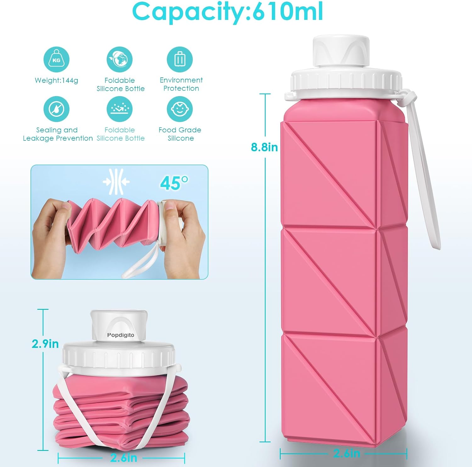 [Large capacity and Light weight]This 20.7oz bottle collapses down to just a few inches.Foldable water bottle can reserve 610ml liquid with only 150g in weight,convenient to carry.This lightweight collapsible water bottle is portable,which can be folded down to one-third of the size after drinking water,saving a lot of space up to 70%.Our leakproof water bottle has soft but which makes it impact-resistant and super durable for sports, gym, camping, and travel.