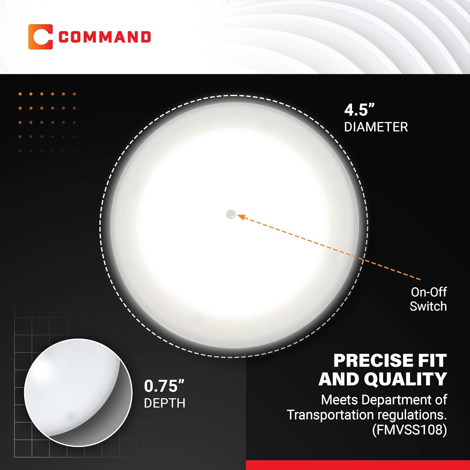 CLASSIC DESIGN: Dimensions of 4.5" in diameter and 0.75" in depth, this light is the perfect size for a subtle yet powerful lighting solution. It’s designed for a 12V system and offers an LED bulb for efficiency. The unit's low profile makes it ideal for spaces that require a clean, unobtrusive look with a convenient switch. Part ID: MODEL 001-1051