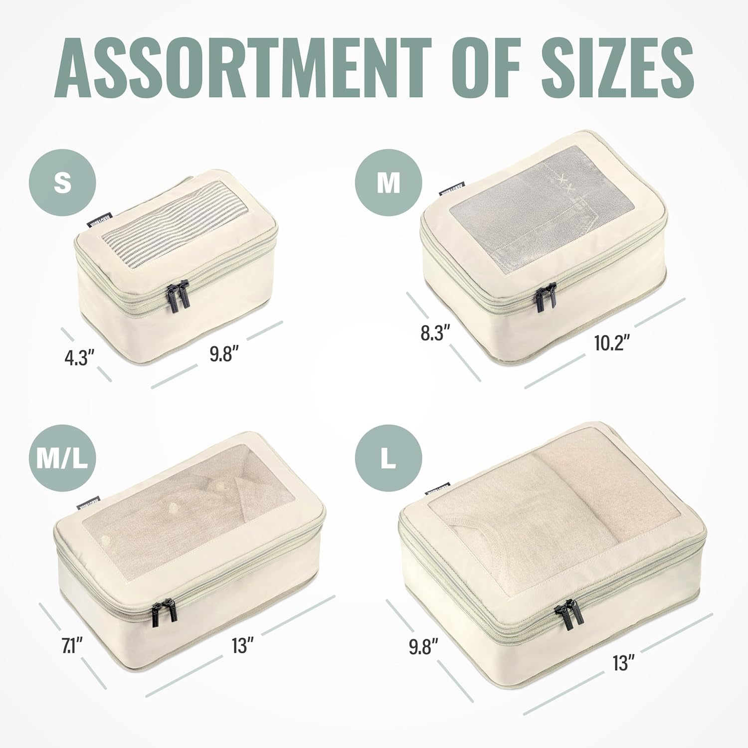 WILL FIT PERFECTLY IN MOST LUGGAGE - Our compression travel cubes will fit perfectly in most suitcases. We recommend 4 PCS set for carry-ons & 6 PCS set for check-in luggage. If you are traveling with a backpack, 4 PCS set will be the right choice for you.