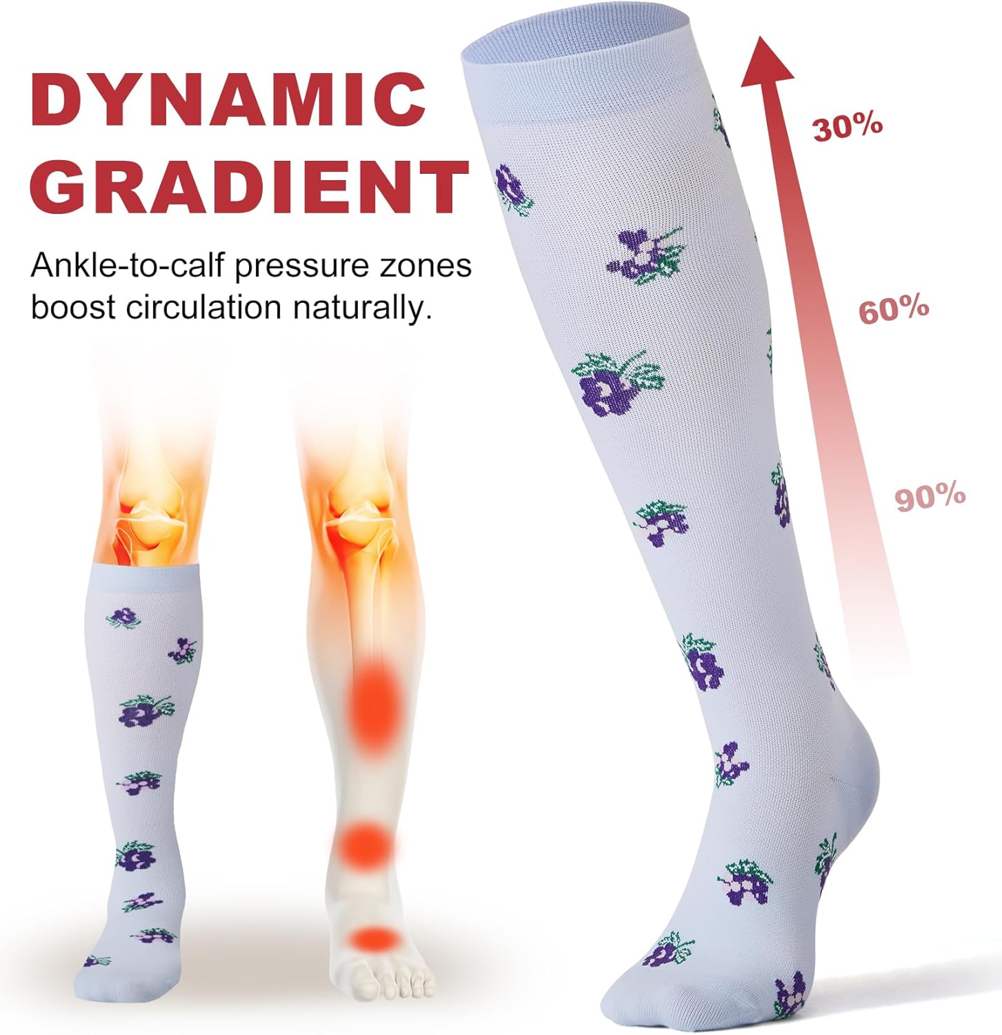 Review: Really great compression socks! The patterns are fun, the colors are bright! The compression is sturdy and helps to support blood flow and reduces inflammation and swelling. Material is stretchy, breathable and comfortable to wear. Runs true to size chart provided on listing. 5-stars, great quality and value, highly recommend!