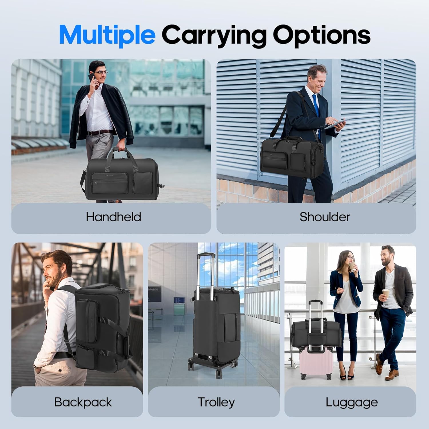 【3-in-1 Convertible Travel Bag (Duffle/Garment Bag/Rolling Luggage)】Easily transforms between three modes: Garment Bag: Internal hanging straps keep suits or dresses wrinkle-free; Duffle Bag: Top carry handles for quick access during short trips; Rolling Luggage: Detachable base with smooth-glide wheels and adjustable handle