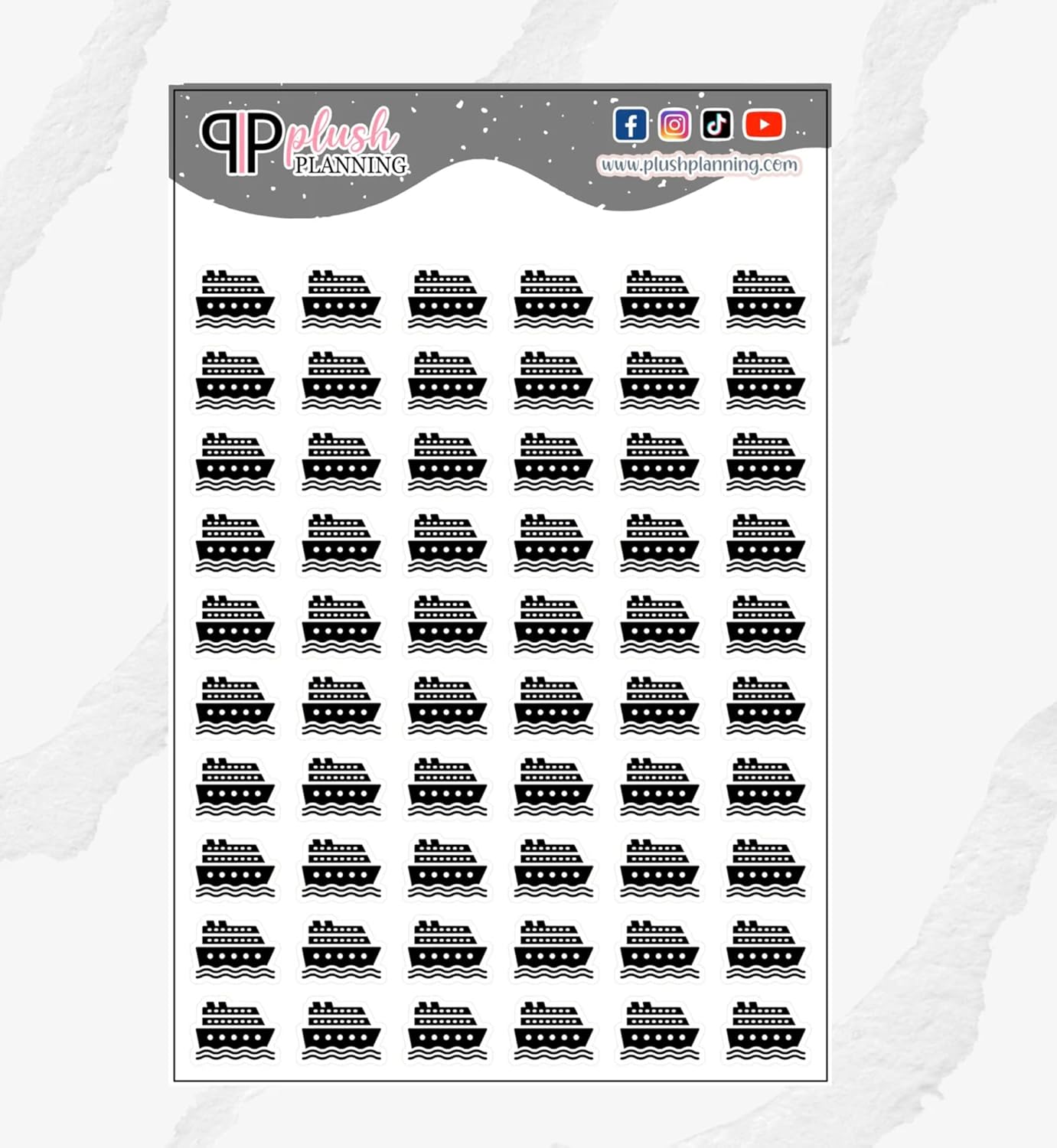 Cruise Ship Tracker Icon Planner Stickers Sticker Size: .780 width inches ; .6 height inches Black Color Sticker Sheet Size: 5.5 inches width ; 8.5 inches height All stickers are printed on Removable Matte Sticker Paper *Disclaimer: Due to different types of viewing screens, colors may vary on screen than they do in person.