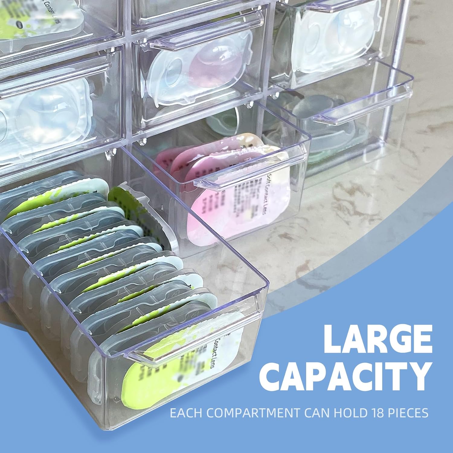 Review: This lenses case fits several sets of lenses in their package in each slot. The container is built well and doesn’t feel cheap or flimsy. The containers are easy to slide out and close. The clear design also lets you easily see what sets are inside and easily find what you need