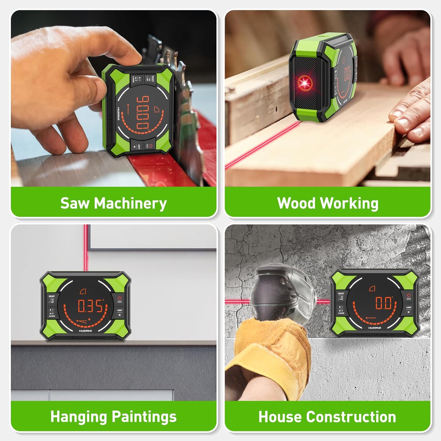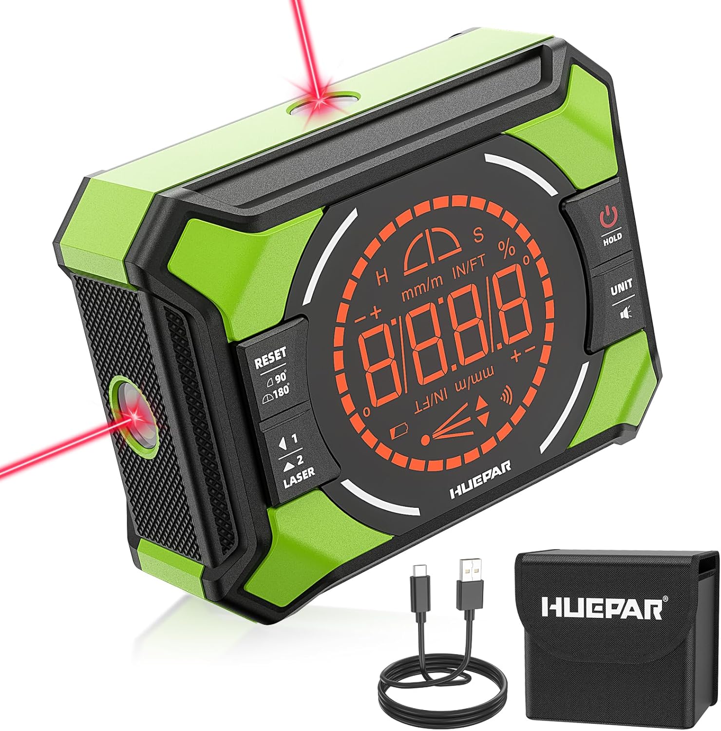Review: Multifunctional 3-in-1 Angle Tool combines the functions of a digital level, angle meter, and laser line projector in one compact device. As a laser level with two beams, it can emit horizontal and vertical laser lines for clear marking. It measures angles from 2×0180°/4×090°, and the measured value on the display is automatically adjusted. An alarm sounds when the angle is within ±1° of horizontal or vertical. The Huepar angle meter offers a high resolution of 0.05° and greater accuracy of ±0.1° at 0°/90°/180° and ±0.2° at other angles, ensuring precise measurements every time. There are two measurement modes to meet different needs: absolute (ABS) and relative (REF). A single short press allows you to conveniently check the actual or relative angle. Additionally, it features data hold, unit conversion, and calibration functions, making it an excellent assistant for woodworking, hanging pictures, painting, construction, and more.The device has strong magnets on the bottom and back, allowing it to be securely attached to ferromagnetic surfaces such as wires, pipes, saw blades, vents, and ducts. With LED segment displays, it provides quick and clear readings in any lighting conditions, and the displayed value automatically inverts when mounted upside down. Built from high-quality materials, it is designed to withstand harsh conditions and ensure long-lasting durability, dust resistance, and IP54 water resistance. The Huepar digital level boasts a powerful 650 mAh lithium battery that charges quickly via a Type-C port, providing up to 20 hours of use on a single charge.