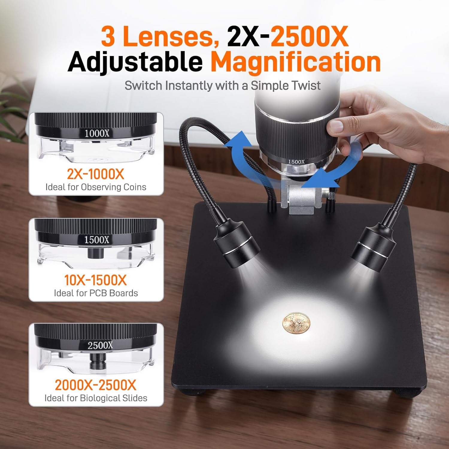 Review: I bought this as a tool for my sharpening business, and it’s one of the better purchases I’ve made. It really helps you develop your process, check your results, understand what your abrasives are really doing. I’m very happy with it overall. So my main use-case is looking at knife edges; bear that in mind. It loses a star over some minor gripes.First: the tray that is meant for holding slides (and is backlit)…is a dead player, I suspect. I plug it in to charge, nothing happens. It feels way too light to have a battery in it, but I don’t see a battery compartment to open. I don’t use it with slides, but I’d be bummed if I bought it for that.The focus knob works adequately, once I figured out how to use it. I initially thought I was supposed to loosen the tension knob, move the screen, then lock the tension knob down. And I was constantly running out of range on the ‘fine focus’ knob. Turns out, I was just being silly. You tension it until it stays put on its own, then turn the knob. Then you can normally use just that to focus, and ignore the fine-focus control on the camera. A less fiddly mechanism that doesn’t need a tension knob would be nice, but…this one works, and at this price point it’s reasonable.I wish the base was more locked-down in rotation. It just has a plastic locknut-type-thing that doesn’t get very tight. Easy to bump it, and the detail or entire item you’re trying to look at flies out of frame. If you’re trying to change magnifications, it’s almost a certainty you’ll do this. I’m trying to think of a good DIY solution.On the topic of magnifications: I don’t really get it. Maybe I need to learn more. The 2500 (max) setting gets some jaw-dropping shots, when you can use it, but it really only works for quite thin objects. You have to put the camera basically on the deck in order to focus it. That’s the one you use for slides, I suspect.Meanwhile, if I frame and focus something at 1000x, then switch to 1500x, I have to move the camera WAY up to focus…and the results look identical (really, I compared). I don’t know much about microscopes or optics, but I’m not sure what I could be doing wrong. I’m not a scientist, I just turn the knob until it’s not blurry.I did lose a couple images once; they weren’t on the card when I read it from my computer. I think I shut it down right after taking them, and I’m guessing it didn’t have time to finish writing. them. Just conjecture, but seems like it could/should be a software fix as there’s no hard power switch.Lastly: the thing’s just fun to play with. Currency looks amazing. Junk mail and styrofoam packaging become objects of wonder. My kids like it, but I’m way more impressed. This thing would have been literal magic when I was their age (and I’m not *that* old). I bought it as a professional tool, but even for novelty/curiosity alone: it’s a good buy.