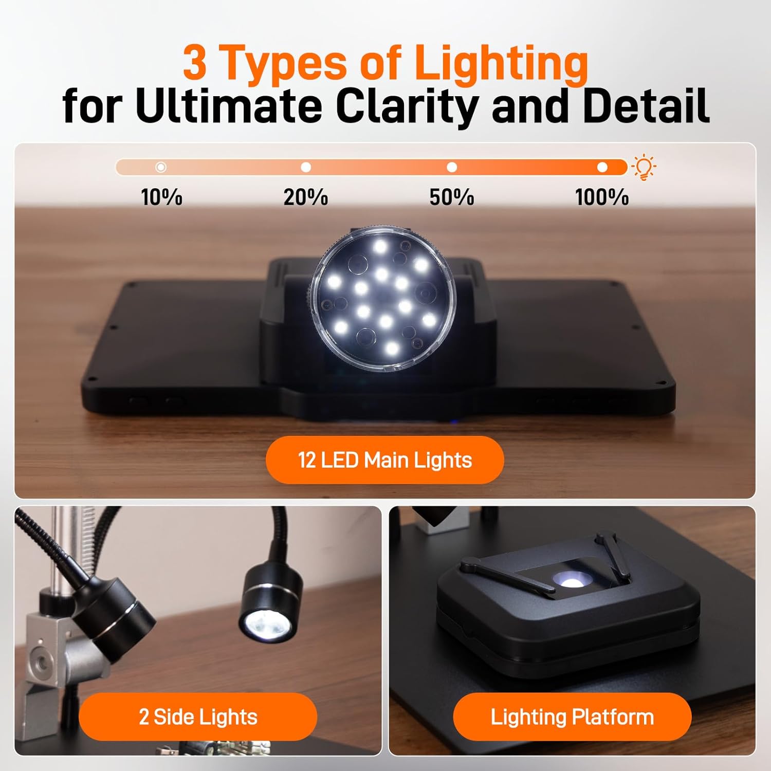Review: Bought this to examine knife edges during the process of sharpening. After a few passes over a belt sander, the microscope is perfect for inspecting the edge for a burr, nicks, or cracks. The adjustable light really helps to reduce the glare.