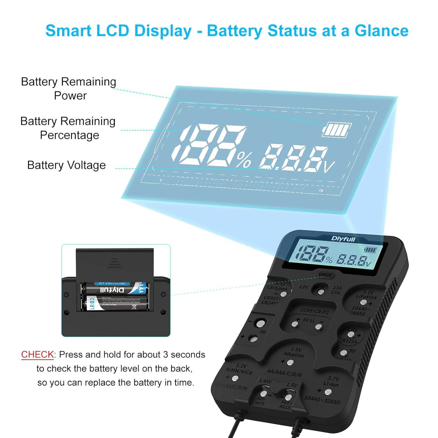 CHECK BUTTON: The household battery checker includes a self-check button. Press and hold for about 3 seconds to perform a self-check and view the power status of the batteries powering the device, allowing for timely replacement when necessary