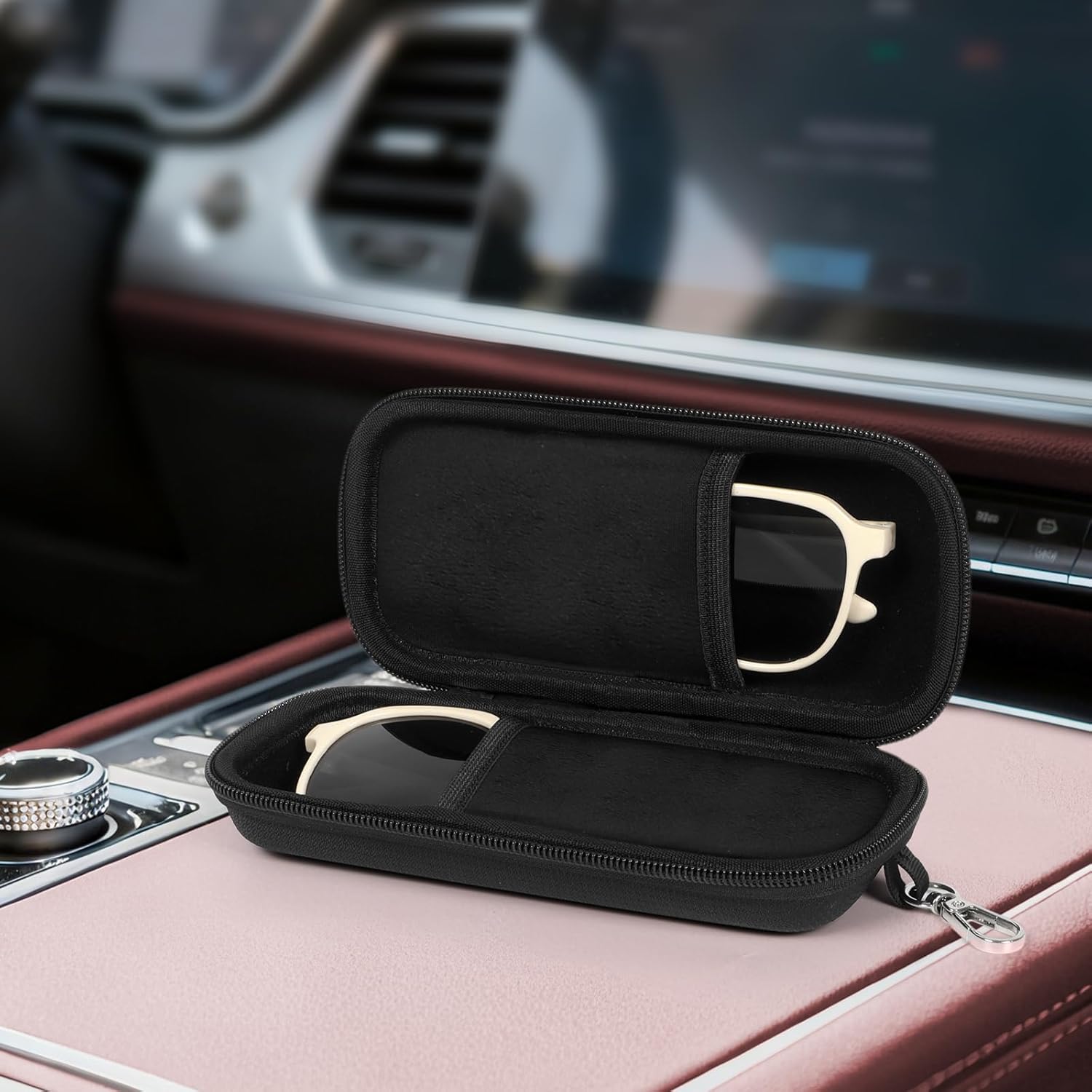 Review: This is perfect protection and smaller than having 2 cases! I have fairly large prescription sunglasses and glasses and both fit. Very durable! Easy to use one handed and still protective if you keep it unzipped and super protective when zipped