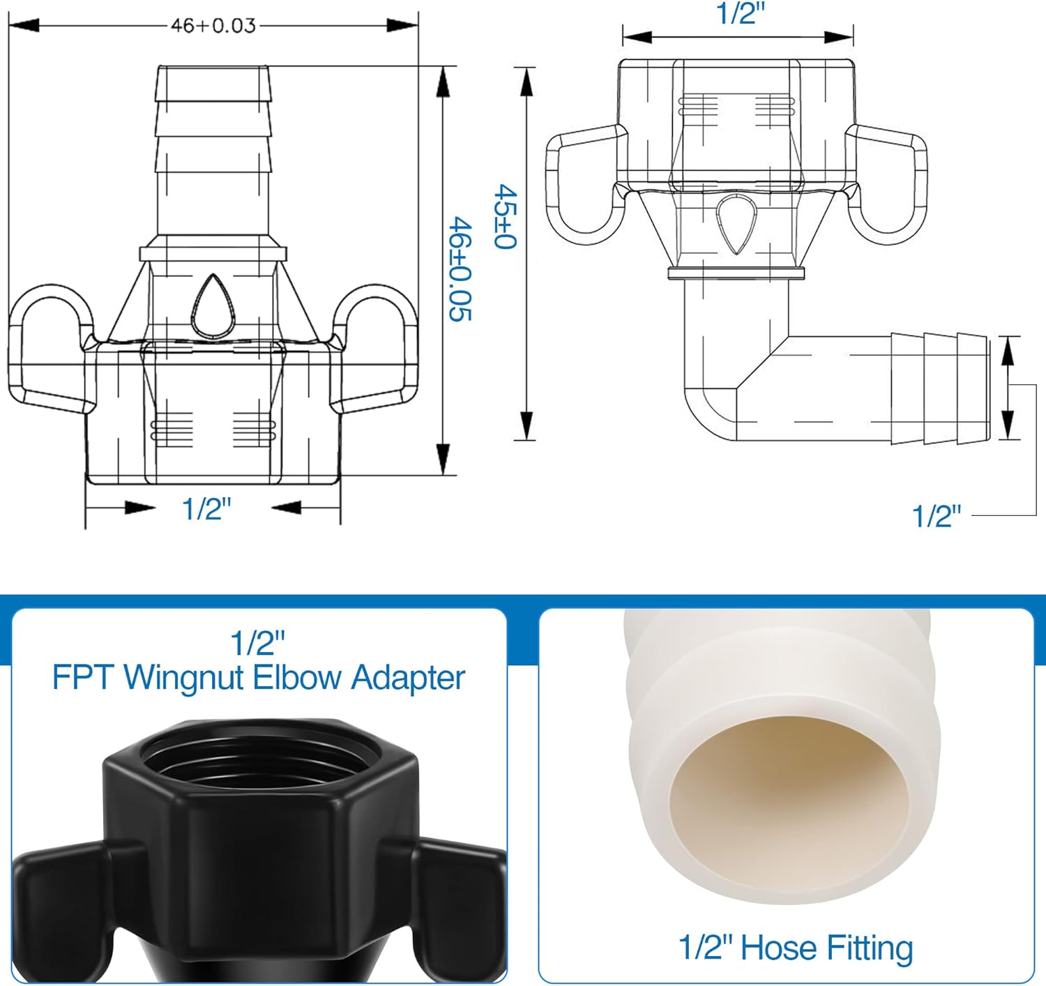 Fits Most: the wingnut adapter fits for the water pump with 1/2 inch outlet, which is suitable for all pumps with 1/2 inch outlet