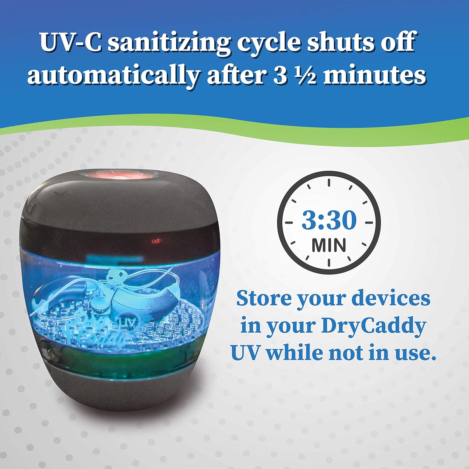 Review: I panicked that it had stopped working a few times, but learned to hold the button down longer.I wear two behind-the-ear aids, and have very greasy ears. I needed a wireless method of getting the aids dried out every day. When I saw this, I was quite excited to get one. The first shipment I received was a totally different product – with an adhesive tag stuck on top indicating it was the product I ordered. (sigh) I returned that one and re-ordered. The right one arrived quickly. I love having it within easy reach of my bed, so I can pop the aids in, start the cycle and get on with life.