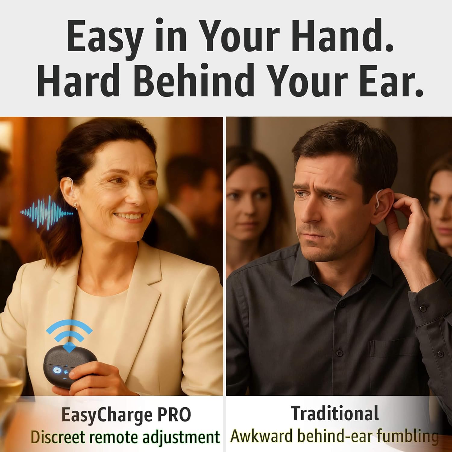 Review: I have been working in chip manufacturing for most of my career. I spend a good part of my day on the production floor where phones are strictly not allowed due to cleanroom and equipment policies. That made finding hearing aids a bit tricky because most of the remote-controlled ones depend on smartphone apps to adjust volume or settings, which is just not practical in my environment.That’s why I went with the EasyCharge PRO, and I gotta say, I’m glad I did.The remote control is what really makes the difference for me. It’s physical, simple, and does exactly what I need it to without any apps or bluetooth connections. The volume buttons have a small bump and dip, so I can feel which way I’m adjusting even if I’m not looking. The program button has a raised dot, kind of like the home keys on a keyboard, so I know exactly where it is just by touch.That means I can keep the remote in my pocket and make quick changes while I’m on the job without having to stop or take anything out. No phone needed, no bluetooth pairing, no screens. Just press the button and move on.The hearing aids themselves are solid. I can hear coworkers better through masks and over background noise. They’re low profile too. A few people didn’t even realize I was wearing hearing aids until I mentioned it.Overall, if you work in a place like mine where phones are off limits or you just don’t want the hassle of app-based devices, this is a smart and practical choice. It’s simple tech that actually respects your environment.