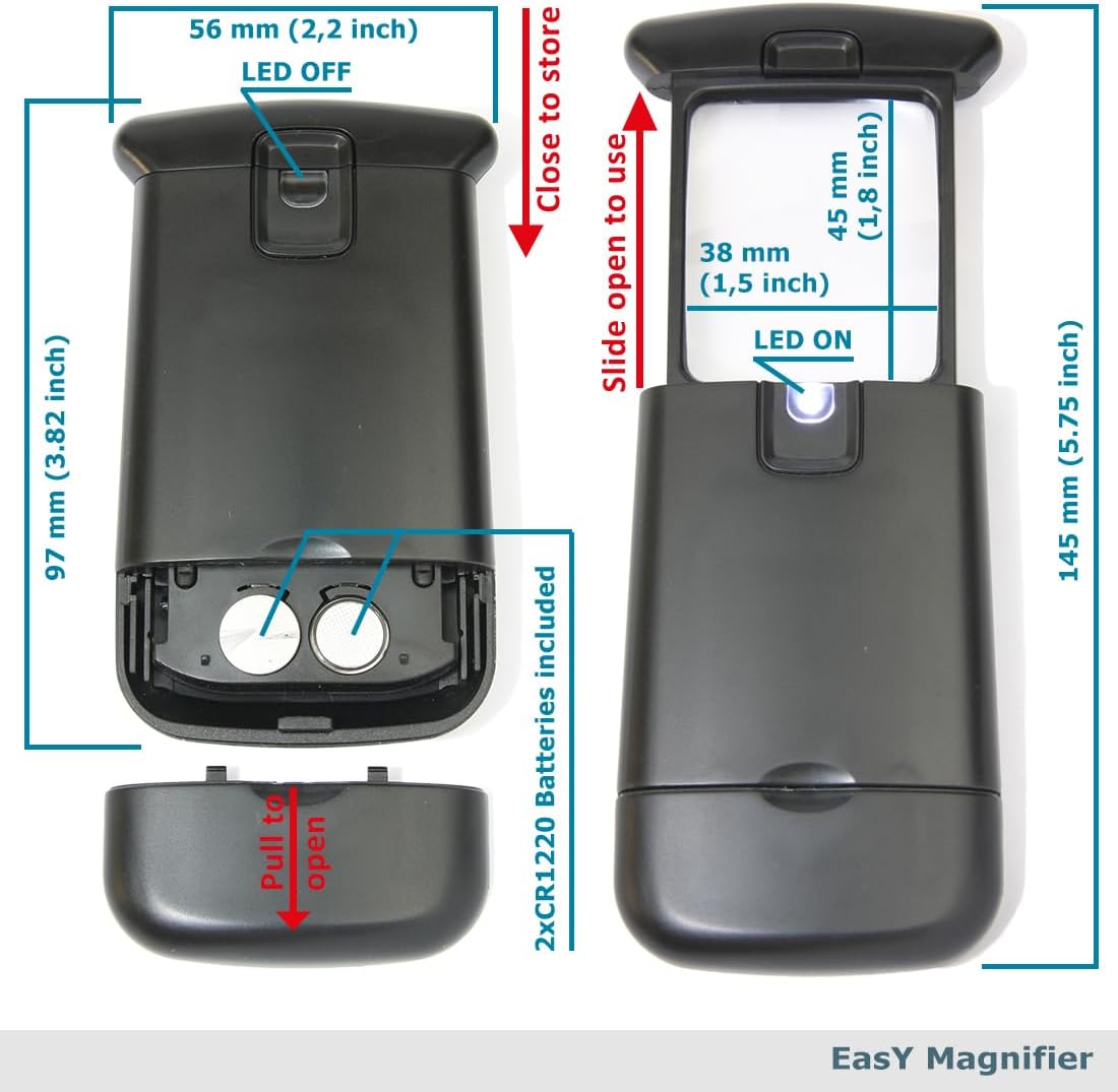Review: I found this great pocket magnifier with LED light on Amazon!! I’m 74 and have challenges reading small print. The Easy Magnifier is handy, easy to use and fits in my pocket!!!I can see much better!!👁️👁️