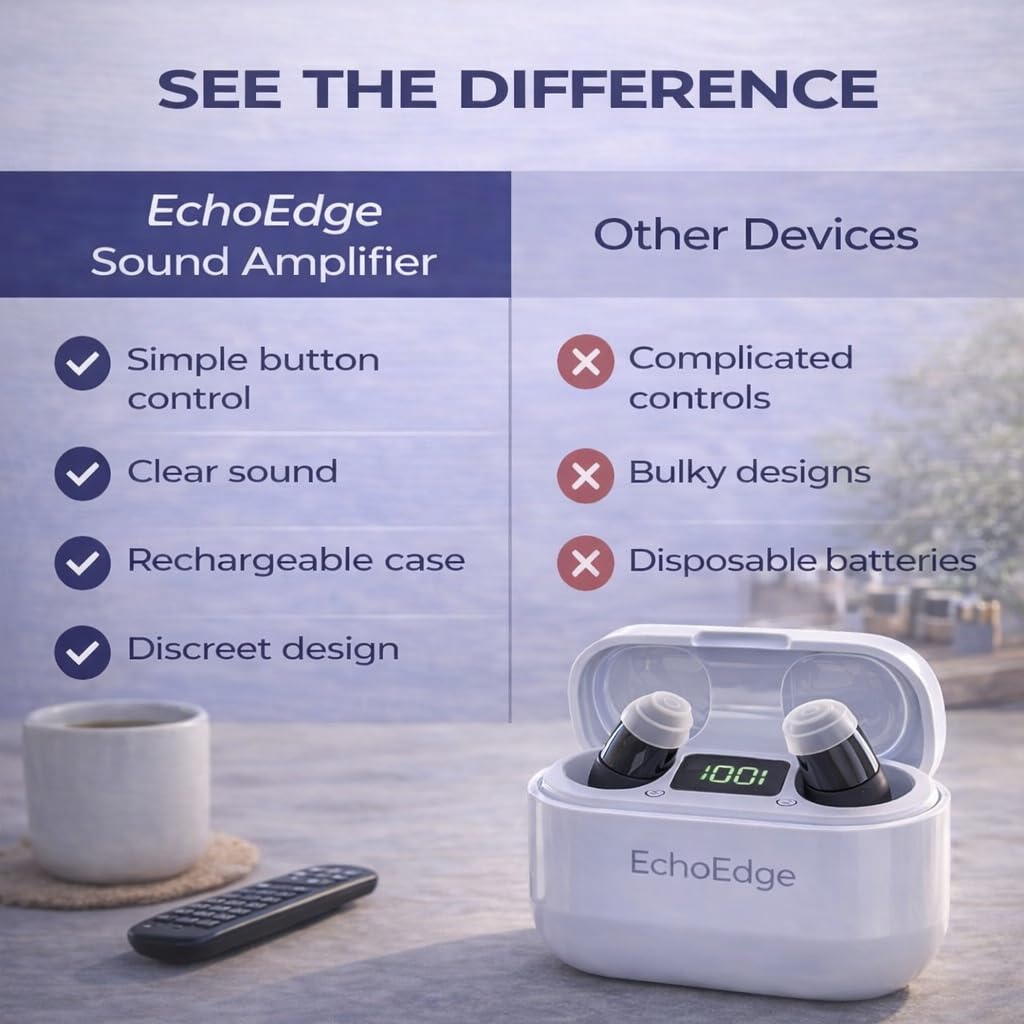 Review: I bought the EchoEdge Rechargeable Invisible Hearing Amplifier for my dad, and we’re both really impressed.The design is very discreet and looks nice when worn, which makes him feel more confident using them every day. They’re also very comfortable, so he can wear them for long periods without any issues.The sound quality is excellent clear and natural, with great noise reduction that makes conversations much easier to follow.The built-in microphone really enhances clarity, and he’s noticed a big improvement in hearing details he used to miss. The battery life is outstanding, lasting up to 30 hours on a single charge, and the HD power display is super handy to keep track of usage. No more worrying about constantly changing batteries.Overall, this has been a fantastic purchase. It’s reliable, efficient, and has made a huge positive difference in my dad’s daily life.Highly recommended