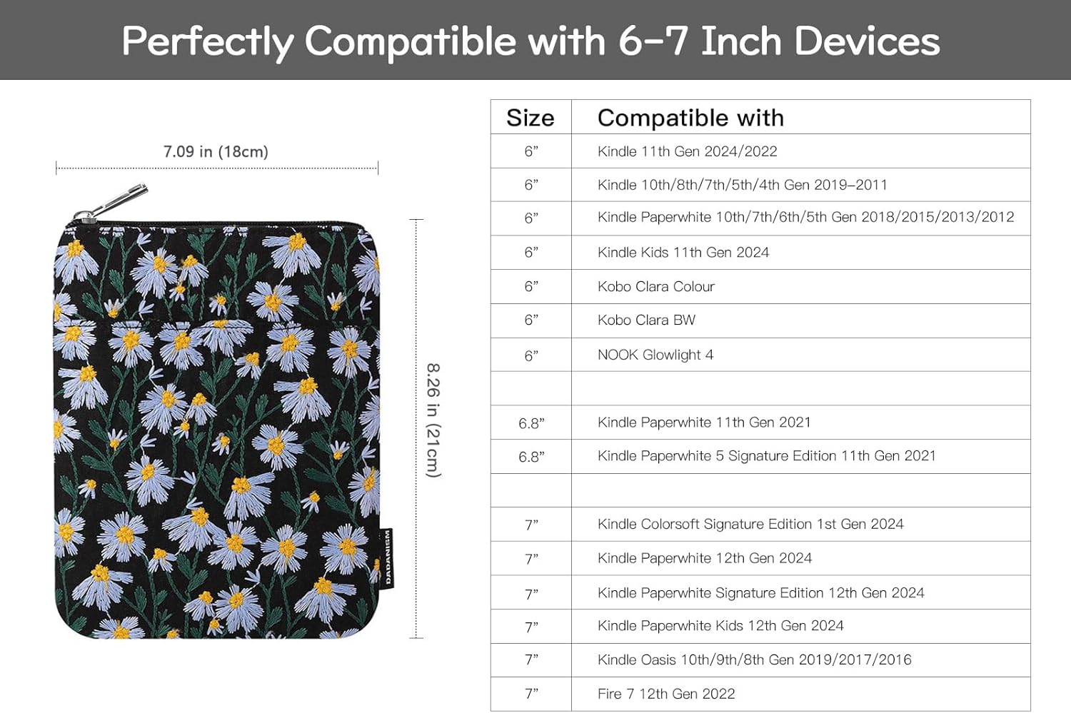 Review: This light weight kindle bag is perfect. It’s embroidered with daisies and is super cute. The zipper works great! It’s very well made.