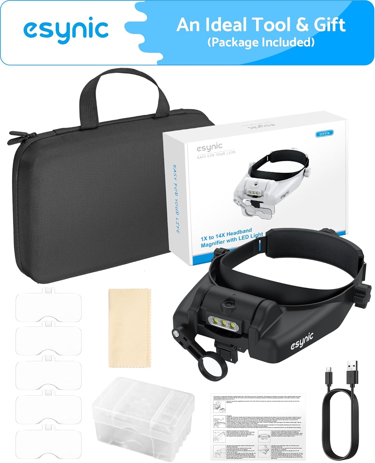 Review: The eSynic Rechargeable Head Magnifier is a fantastic head mount magnifier!It has a rechargeable light to help see which is great so you will never run out of batteries.The headpiece is very comfortable and adjustable to suit your head. The material build is very good and feels of a durable, long lasting substance.The lenses and magnification are very very good! The lens material (plastic?) is very good quality and light transmission is great. The assortment of lenses allows for different magnification levels.Very good for up close inspection of PCB’s, jewelry, anything that is very small!VERY HIGLY RECOMMEDNED.EXCELLENT