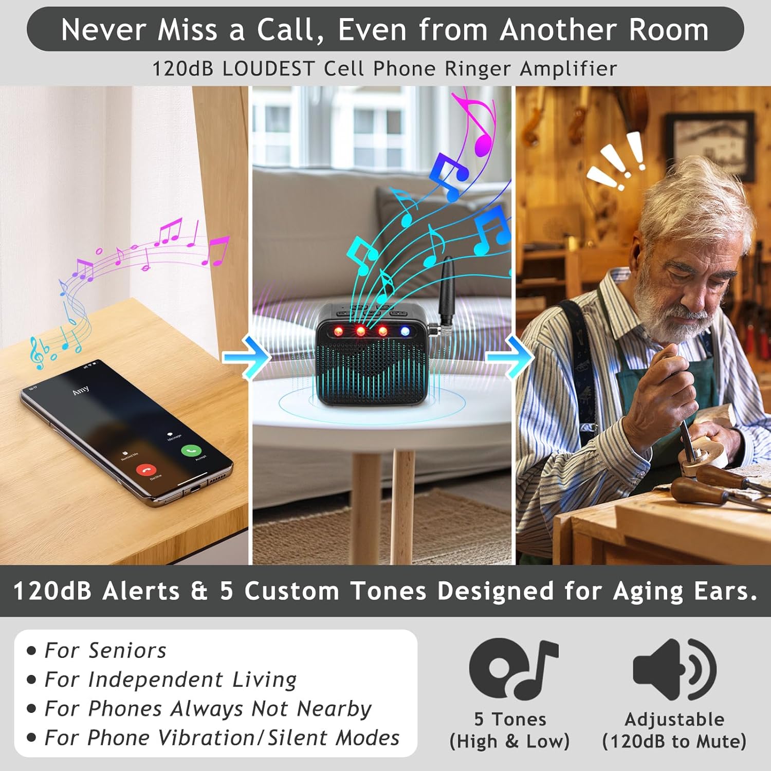 Review: I got this ringer for my dad, who struggles to hear his phone, and it’s been a godsend for keeping him connected. The 120dB alert cuts through TV noise, and the LED flashes are impossible to miss, even across the room.Pairing was a one-time setup, and the auto-reconnect works flawlessly when he moves to the porch—150ft range covers his whole house. The five tones let us pick a pitch he hears best, and the tactile buttons are senior-friendly.It’s plug-in, no batteries to fuss with, and the privacy-safe design means no call rerouting. It’s helped him find his phone under couch cushions too.We’re setting it up for holiday visitors to ensure he catches every call. It’s a reliable, thoughtful gift for anyone hard of hearing who needs a loud, visual nudge.