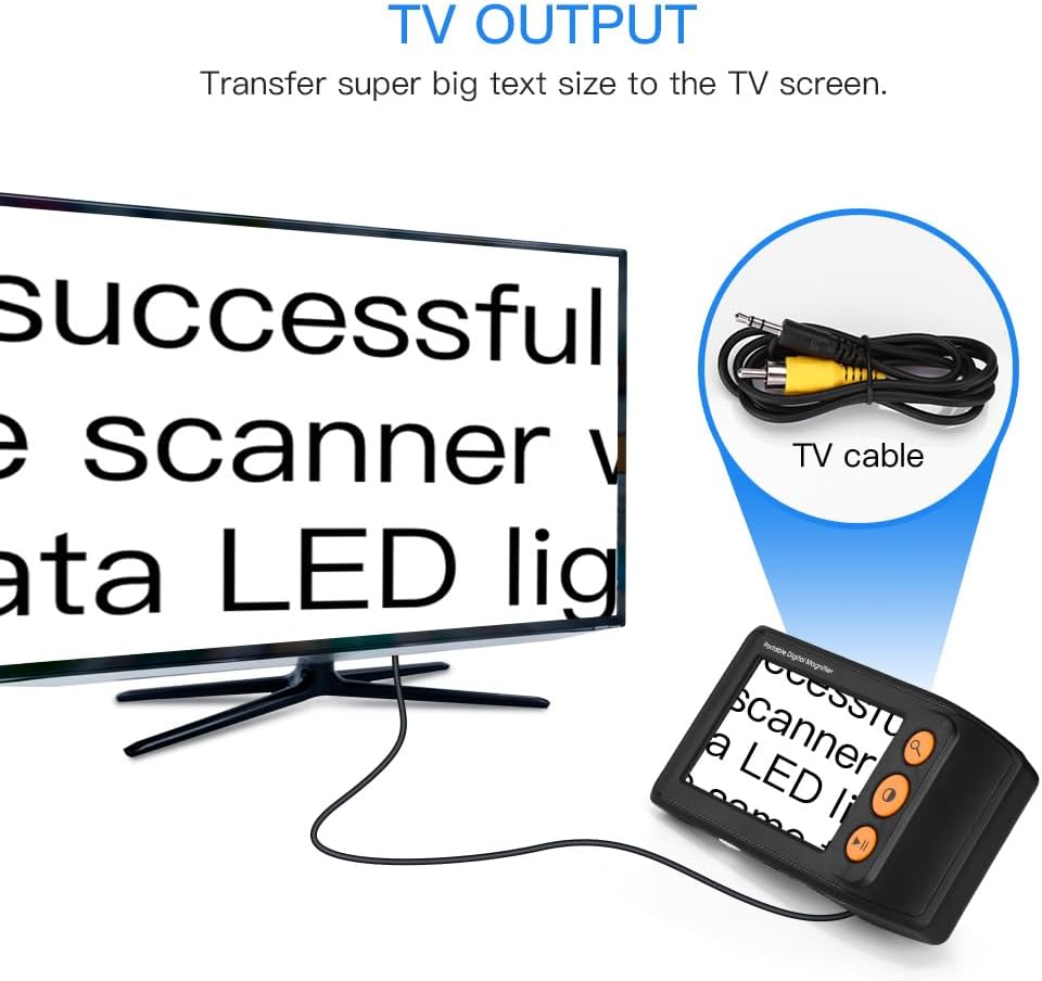 Review: Great reading device, it is so helpful. My mom had used a similar one and I ordered for a friend in need of something similar. It has been so helpful to helping her vision. It will contrast to whit on black, white on blue, blue on white, blue on yellow or just plan magnify black on white. There is a real style cable for hooking up to an older television as well. I highly recommend this to anyone that is having vision issues.