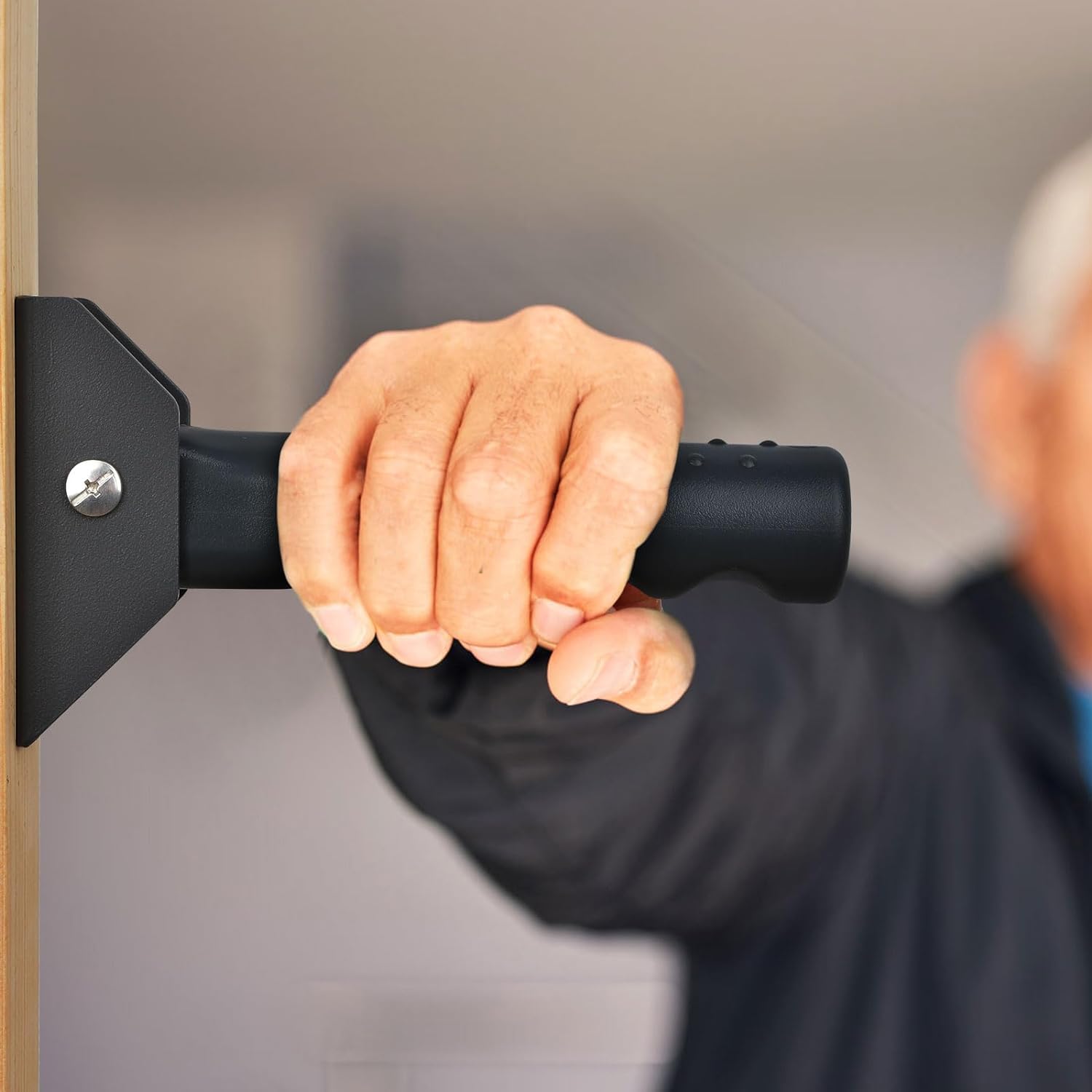 Review: Perfect for our wide doorway with a step down. We place one on each side of a five foot wide doorway leading into our kitchen. After my surgery I would not have been able to navigate the step without these handles. They are steady, easy to install and very functional They fold up nicely when you don’t need them and were perfect solution for maintaining my independence.