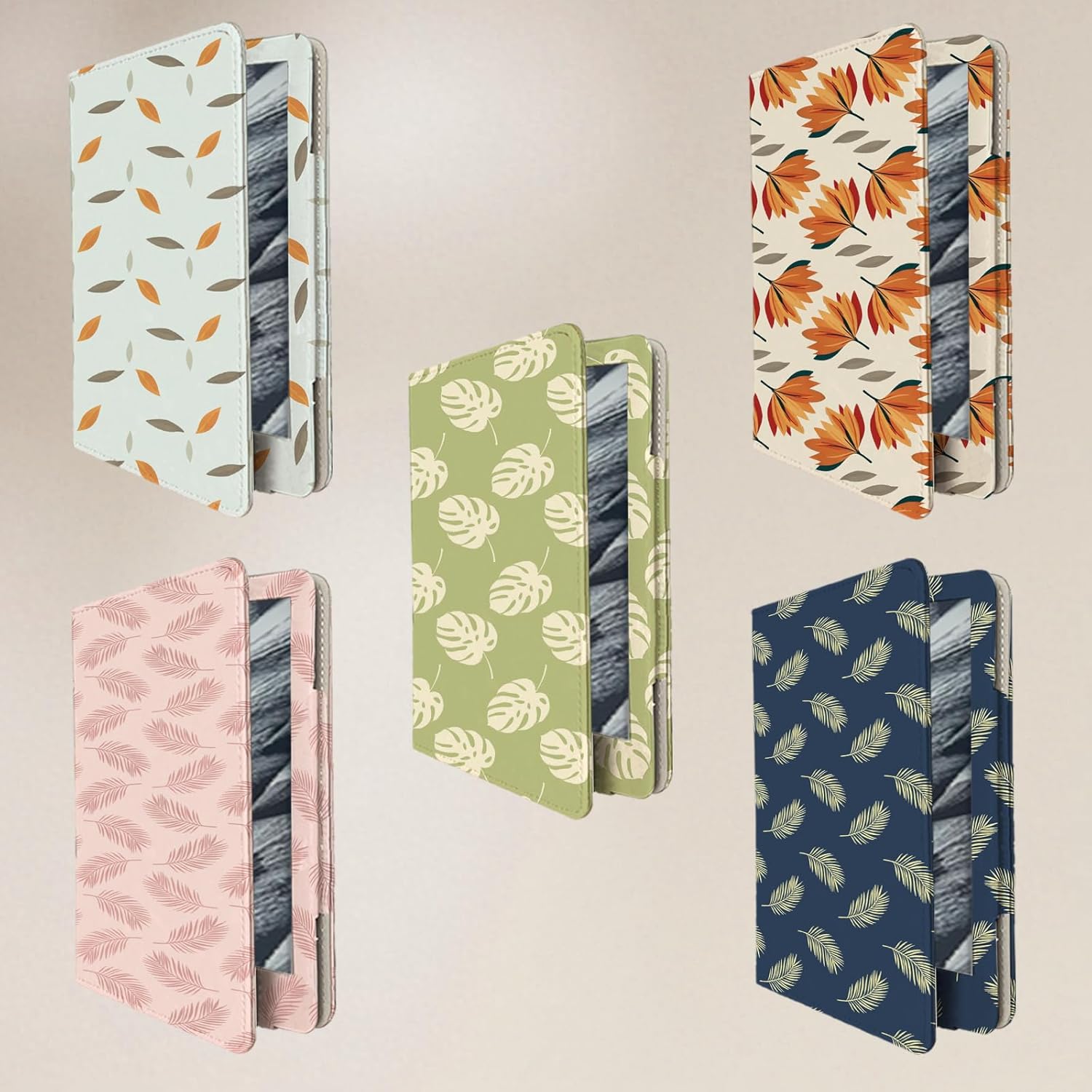 Review: There are several variations in the listing. I’m reviewing the pink palm leaves version.For reference, I’m using it with my Kindle Paperwhite Signature Edition (32 GB) (6.8” display) that’s from 2023. It did fit this model well overall with a good fit. I had no issues with it blocking access to the charging port or screen navigationThis is overall a good value for a nice quality case for some (but not all) e readers and Kindle e readers. While I like it, I do think that there are some things I’ll explain that keep it from being my favorite case, but I still consider it a good one over all and would recommend it.You’ll need to be very careful to check your model’s model, year and generation to be sure it will fit. If you don’t know your model’s exact specifications, you can as I did check your order history or go into your devices section where they have those details. Remember the generation and model year are key to a good fit. They do show in the listing details and pictures which models it does and doesn’t fit.In the pink palm leaves variation the colors in person are true to how they look in the pictures. The background is a light pastel pink. The palm leaves are in a monochromatic mid toned pink. It’s attractive and looks nice in person. The colors and patterns are neutral enough to match and coordinate with other pink and pastel items.The case isn’t a hard plastic. It’s a thick, nice vinyl covering over a sturdy, hard cardboard. There is a touch of slickness to the vinyl and I did find it a touch slippery to the touch but not overly so. The thickness and quality of the case and the vinyl is good. It’s well made, nicely finished and the stitching is well done. I didn’t notice any odor to it and would consider it safe for those sensitive to scents.It is slim and lightweight and not overly heavy or bulky. It says in the listing that it does have some shock absorption. It likely does but it’s not going to be the same as a hard plastic TPU case with more protection. For heavy travel use, I would still prefer my TPU case for more protection.It says it has a magnetic auto wake and sleep feature. I did find that when I opened the case it was starting to wake up my Kindle. If you have a wake code on your Kindle, you’ll obviously still have to enter it on the screen as normal. It’s harder to tell on the sleep feature. I always manually turn my Kindle off for sleep to be sure I don’t waste battery.It does have a picture frame like stand on the inside front cover. It does fold up fairly flat and it works fairly well when used to hold up the kindle. I did have issues with it being level during use as I’ll describe below. It can only be used in portrait mode vs landscape mode. You can hold onto the stand or the strap in the inside when you fold it back away from the front cover to use the Kindle.There are a few things to keep in mind about this case that are minor but notable issues. It does not have a secure magnetic closure, snap closure or strap to keep the cover secure on the front. It does tend to fall open and isn’t secured closed. This is going to be an issue if you’re traveling it or putting it in a tote or bag. I would have preferred a secure closure for the front of the case.The stand area is inside the case on the inside front cover. When the case is folded shut, this area presses and touches directly on the Kindle screen. I did feel it for any sharp or rough areas, and didn’t feel any. But if you’re traveling or carrying it a lot, the movement of that could cause some friction. I would have greatly preferred the stand on the outside vs inside of the case.The pocket on the outside back cover isn’t large enough to use as a grip or holder. I don’t think was meant to be used for a hand holder or grip, but it isn’t going to be large enough to hold even for those with smaller hands. It’s meant as a small storage pocket vs a grip. It’s more for ID and small cards in size. There is no outside grip for the case built in.When you use the stand it sits like an old fashioned picture frame stand in shape and the way it sits. It is fairly secure and stays upright well. However, it’s difficult to get the Kindle perfectly level in the case when using the stand. You’ll first want to be sure it’s level inside the case itself and adjust it in the inside holder. But after that I found it was still not perfectly level even on a flat surface, close but not quite perfectly level.The issue is the way the case sits. The stand is on one side (inside front) of the cover folded back away (outside) from the other area (inside where the Kindle sits). Because there are two pieces of the cover, (which is normal and standard) they sit a little different when folded. It’s hard to explain but I struggled to get the Kindle in the case perfectly level. I had to keep adjusting the case to get it level. I got it close enough to be comfortable, but would have preferred it be easier to level it without having to adjust it as much and a more accurate level vs close.The case holds the Kindle inside in an envelope like way with a flap you secure once it’s placed inside. You’ll have to be careful to align it properly and be sure it’s secure. It does feel secure but it isn’t as secure as a snap in style case.While the case material is nice, attractive and good quality, it is very slightly slippery in texture. It’s a thick vinyl over cardboard style case vs plastic. I found that the texture was slightly slippery to hold. It wasn’t so slippery it wasn’t usable. But compared to my standard, plastic, snap in style case, I could feel a difference immediately.Personally I will still mostly use my TPU plastic standard case due to it being less slippery and that it stays closed on the front better. I’ll be using this when I need the stand feature. I would still suggest you have a snap in case with no stand inside the front for general use. Use this