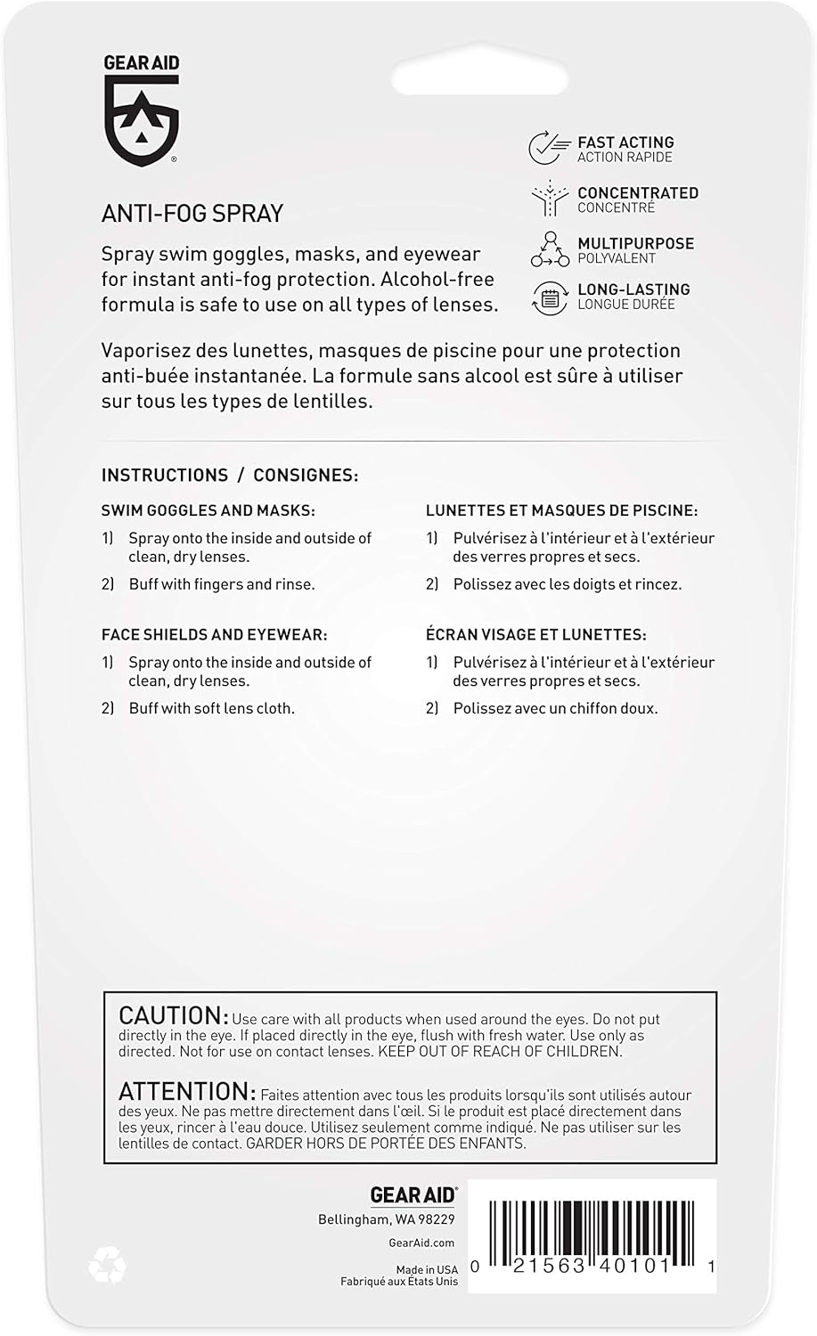 B001QKXKAU, Clear vision is important for any type of activity. Use GEAR AID Anti-Fog Spray to keeps a variety of eyewear and protective lenses clean and fog-free. This 2-in-1 formula is designed to prevent fogging on all types of wet and dry lenses, while also acting as an alcohol-free cleaner. It works on swim and ski goggles, dive and snorkel masks, non-AR (anti-reflective) eyeglasses, sunglasses (without CAB/CAP coatings), face shields, safety glasses, and more. Previously known as Sea Quick, it’s highly concentrated with a single 0.5 fl oz bottle lasting multiple treatments (150 pumps)…., 4,