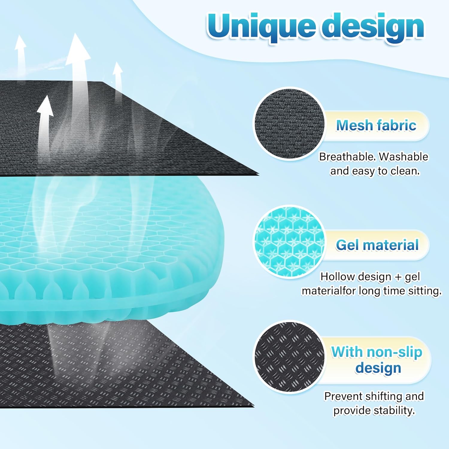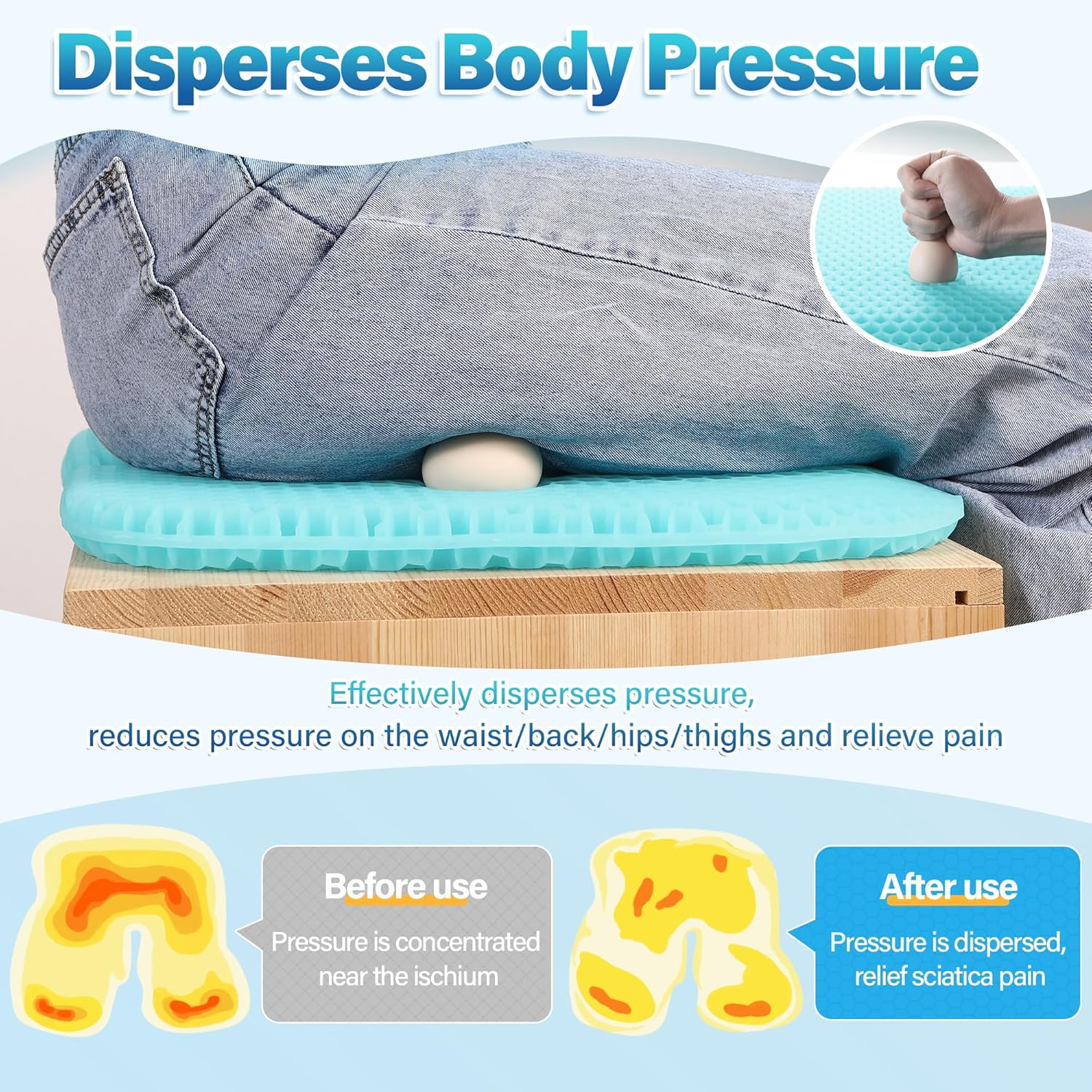 【Cooling and Breathable】this gel seat cushion made from TPE gel with over 2,000 ventilation holes, this seat pad promotes air circulation.The gel material has excellent elasticity and durability, extending the gel cushion's lifespan. Suitable as cooling seat cushion, cooling car seat cushion,cushion for office chair,desk chair cushion, stadium cushion,cooling gel seat cushion,seat cushion for chair,gel seat cushions for pressure relief,office chair cushion for butt.