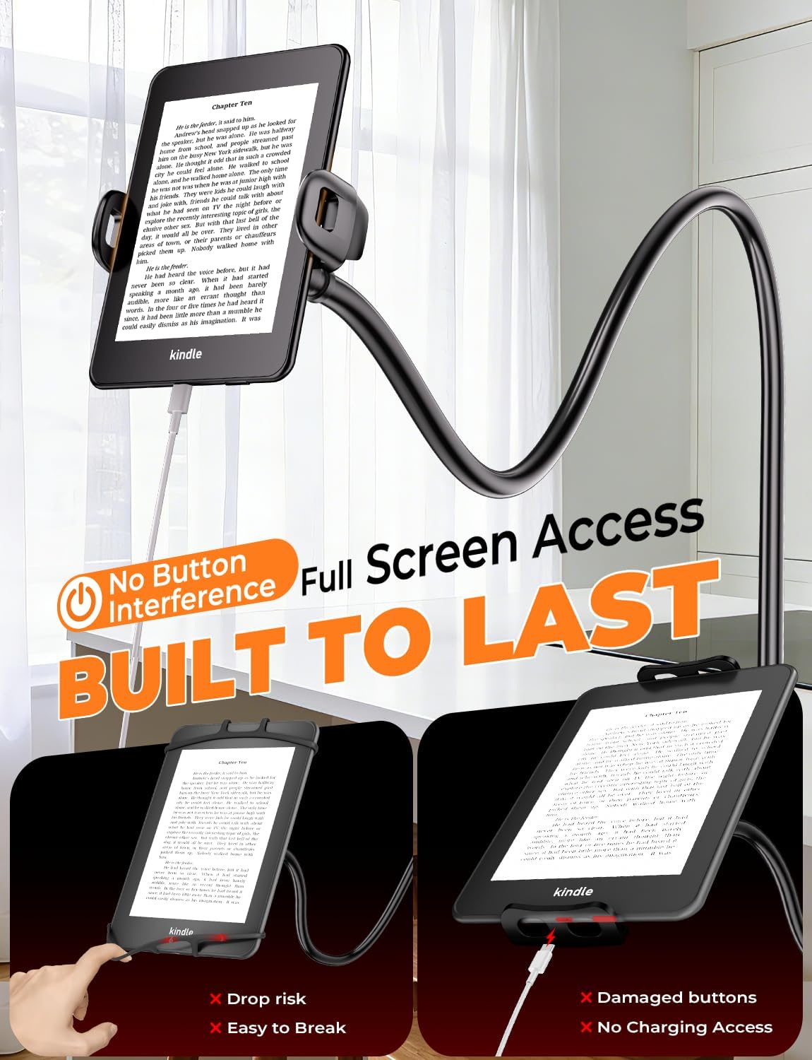 Review: I’ve been using the Mumay Gooseneck Kindle & Phone Holder for a couple weeks now, and it’s a total game-changer for bedtime reading. The flexible long arm bends just right to position my Kindle or iPhone exactly where I want it, whether I’m lying down or propped up, so my hands stay free under the covers. It clamps super tight to my bed frame or headboard without slipping, even after I nudge it around. Works great with my Kindle and bigger phones up to 8.6 inches—no wobbling or dropping. Setup took like two minutes, and it’s sturdy but lightweight enough not to feel bulky. Love how it makes late-night scrolling or reading so comfy; totally worth every penny for anyone who reads in bed.