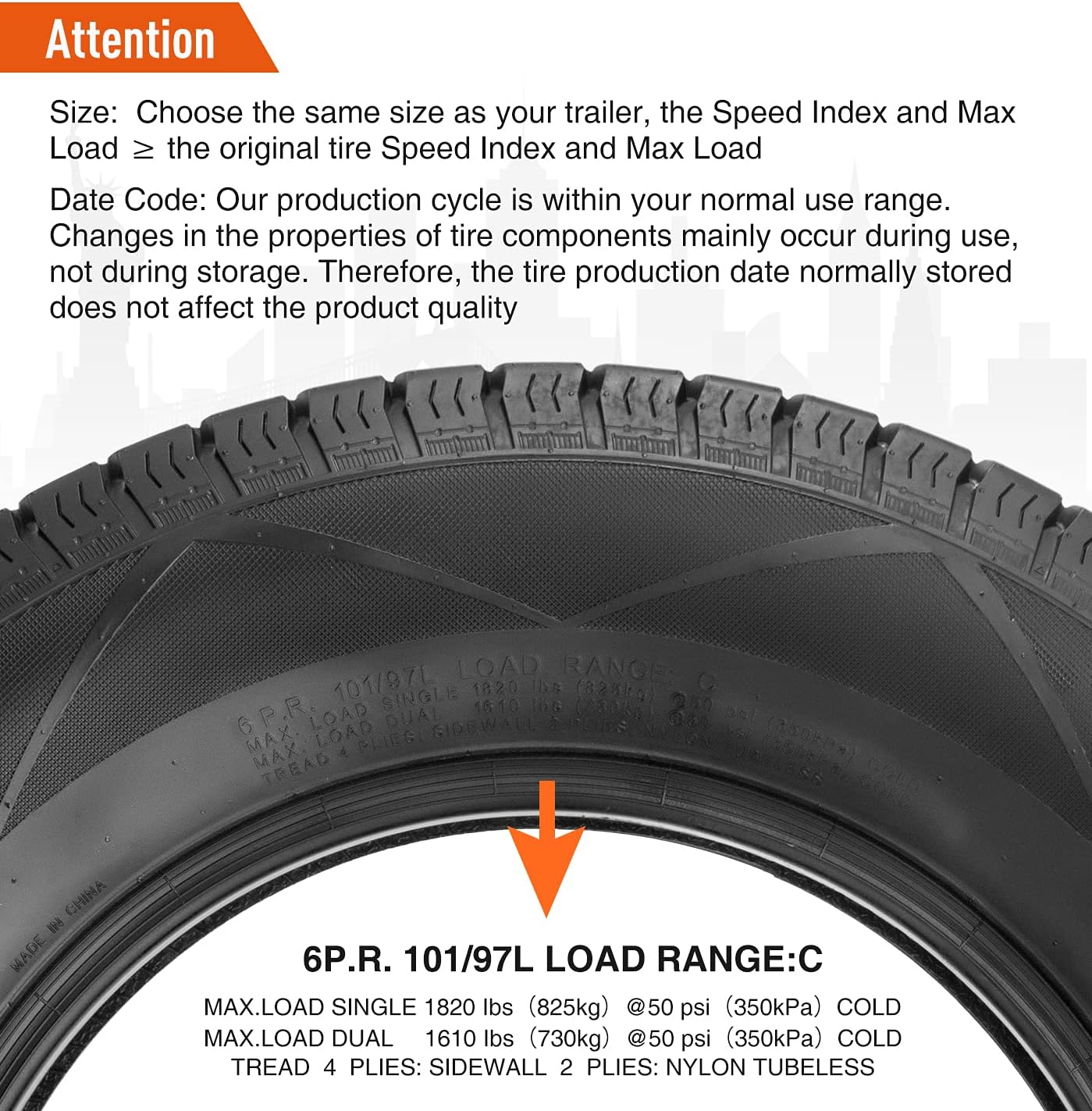 SIZE - Trailer Tires 205/75D15 ST 205/75D15 205 75D15; Load Range: C = 6 Ply Construction. Max Capacity: 1815 pounds, Maximum PSI: 50, Rim Diameter: 15", Rim Width: 5.5", Speed Rating L