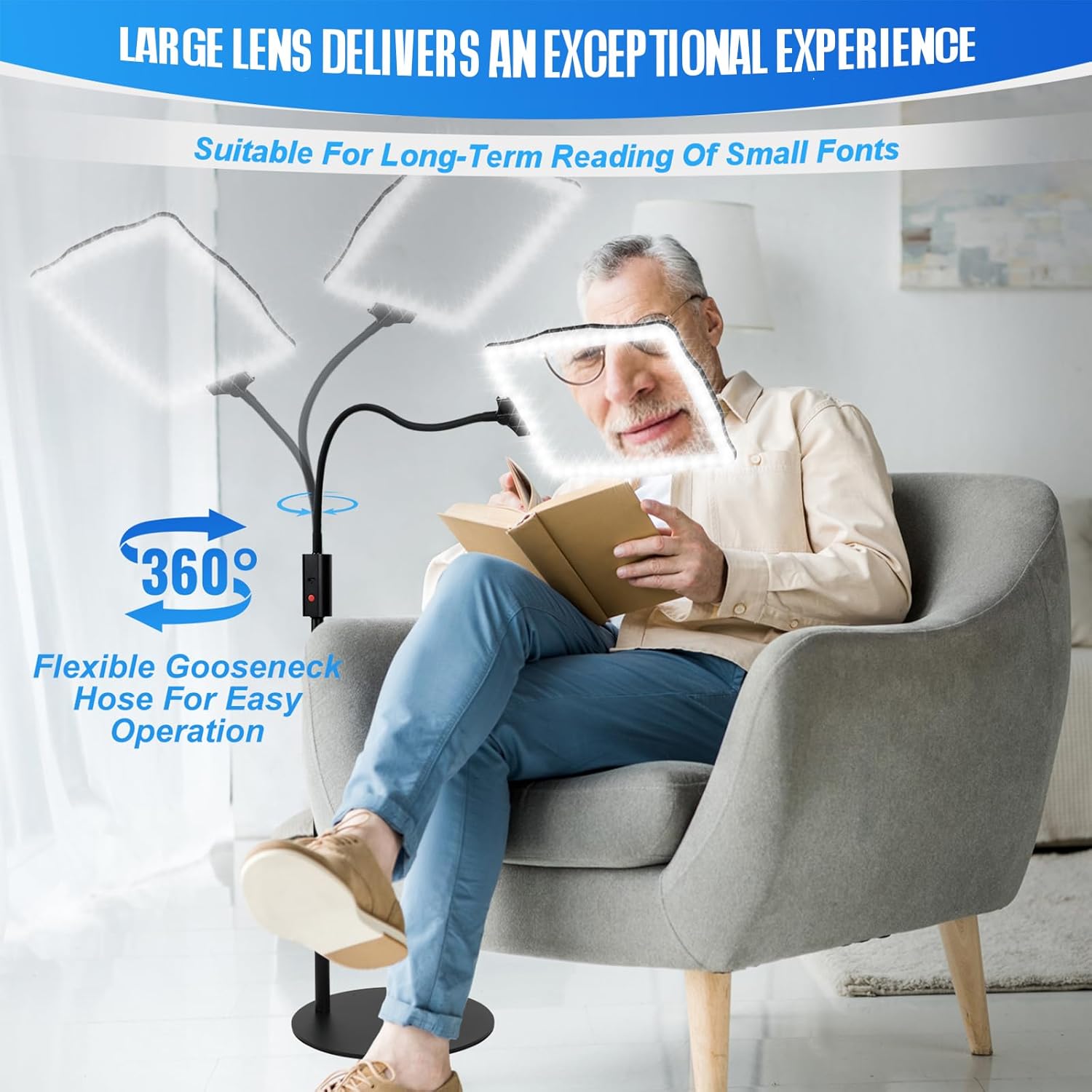 Review: I have an older family member who has diminished vision. Even after enlarging the type on her devices, she still cannot see them clearly. We decided to try this magnifier to see if it would be easier for her to see. It has been helpful.The magnifier is sturdily built, and assembles easily following the directions by screwing the posts together to the base, to each other, and to the magnifier.There is a light built into the frame around the magnifier. It is and LED light powered by a battery; the unit is rechargeable using a USB-C charger; this freedom from cords makes it more portable and adjustable.The magnifier is large, and the image is clear. The stand has a telescoping pole which allows the height to be adjusted to the situation. The top portion has a flexible gooseneck which both bends and turns. She is able to set the height to suit her when seated in her recliner, and to adjust the neck so it is aligned with her line of sight.This has already made a big difference in her ability to see and use her devices, and thus has improved her ability to communicate.This is a well-designed, sturdy, clear magnifier that suits it’s purpose well. This one is very easy to recommend, should you be in search of such a device.