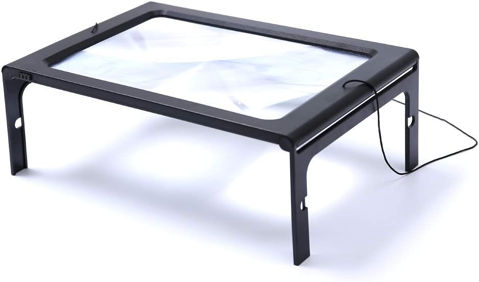 Review: I prepare hundreds of tax returns every year, and every year the print on W-2s and other tax documents seems to get smaller and smaller. Eye strain is a given in my line of work. It became so frustrating trying to hold a hand held magnifying glass with one hand while trying to type with the other hand… This full page self-standing, lighted magnifier solved the problem. It allows me to clearly see the numbers on the W-2s while at the time typing the information into the tax software. I plug it into the USB port of my computer, for the lighting and fold the two front legs down so I can easily position the documents under the magnifier and view them at an angle on my desk. I keep one on my desk at the tax office and I purchased a second one for my desk at the law office. It is helpful in both places, but helped me the most, by far, when trying to read and type at the same time. This is an excellent product for my purposes, and I am considering purchasing a third to keep on my desk at home.