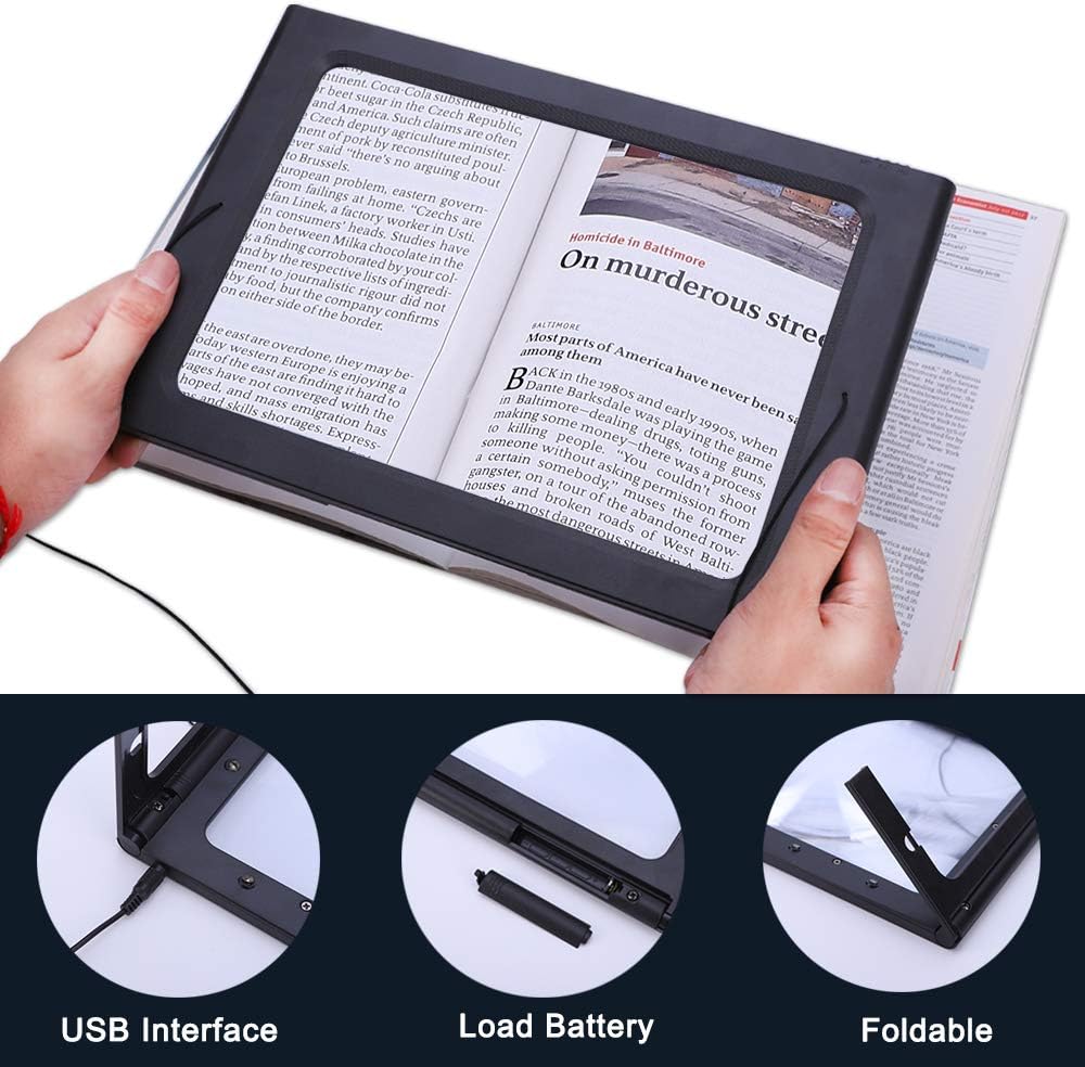 Review: I prepare hundreds of tax returns every year, and every year the print on W-2s and other tax documents seems to get smaller and smaller. Eye strain is a given in my line of work. It became so frustrating trying to hold a hand held magnifying glass with one hand while trying to type with the other hand… This full page self-standing, lighted magnifier solved the problem. It allows me to clearly see the numbers on the W-2s while at the time typing the information into the tax software. I plug it into the USB port of my computer, for the lighting and fold the two front legs down so I can easily position the documents under the magnifier and view them at an angle on my desk. I keep one on my desk at the tax office and I purchased a second one for my desk at the law office. It is helpful in both places, but helped me the most, by far, when trying to read and type at the same time. This is an excellent product for my purposes, and I am considering purchasing a third to keep on my desk at home.