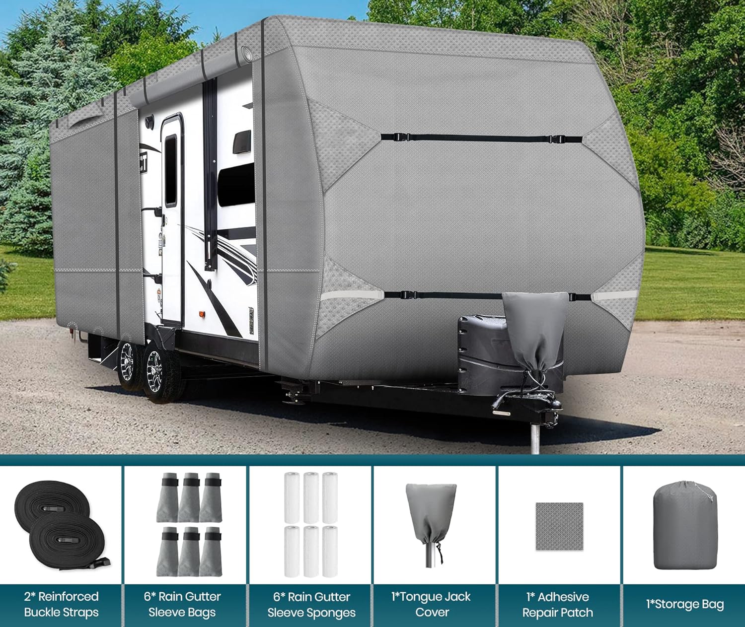 Abundant Winter RV Cover Accessories - 1 camper covers perfectly fits 20ft-22ft RV. (Please measure before purcahse, measurement should include the bumper, ladder or spare tire, but not include the hitch! ); 1 storage bag; 1*tongue jack cover ; 6 gutter cover with sponge; 1 adhesive repair patch; 1 usage instructions. please rest assured to buy!