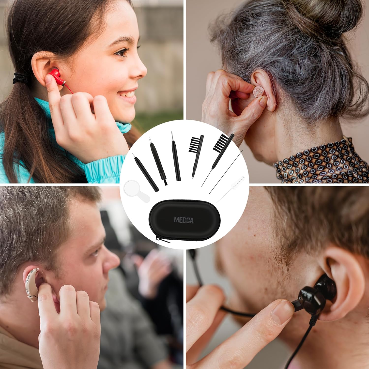 B0F6Q5S41B, Keep your hearing aids and small electronics performing at their best with the MEDca 20 Piece Hearing Aid Cleaning Kit. This complete tool set includes a screwdriver, tube brush, housing disassembling tool, cleaning wire, multifunction brushes with wax loops, a cleaning cloth, 10 hearing aid wipes, a magnifying glass, and a zippered carrying case for convenience. Regular use of the kit helps remove wax, moisture, and debris, protecting devices from damage and improving sound clarity and battery life. Built with durable, reusable materials, the soft nylon brushes and specially…, 4.5,