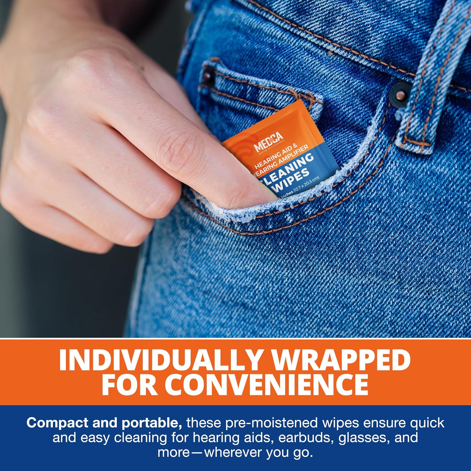 100 COUNT – EFFORTLESS CLEANING, ANYTIME, ANYWHERE: Maintain pristine hygiene for your hearing aids, earbuds, glasses, and more with MEDca’s individually wrapped cleaning wipes. Designed for convenience and portability, these pre-moistened wipes are your go-to solution for quick and effective cleaning on the move. Their compact size makes them perfect for carrying in your pocket, bag, or travel kit.