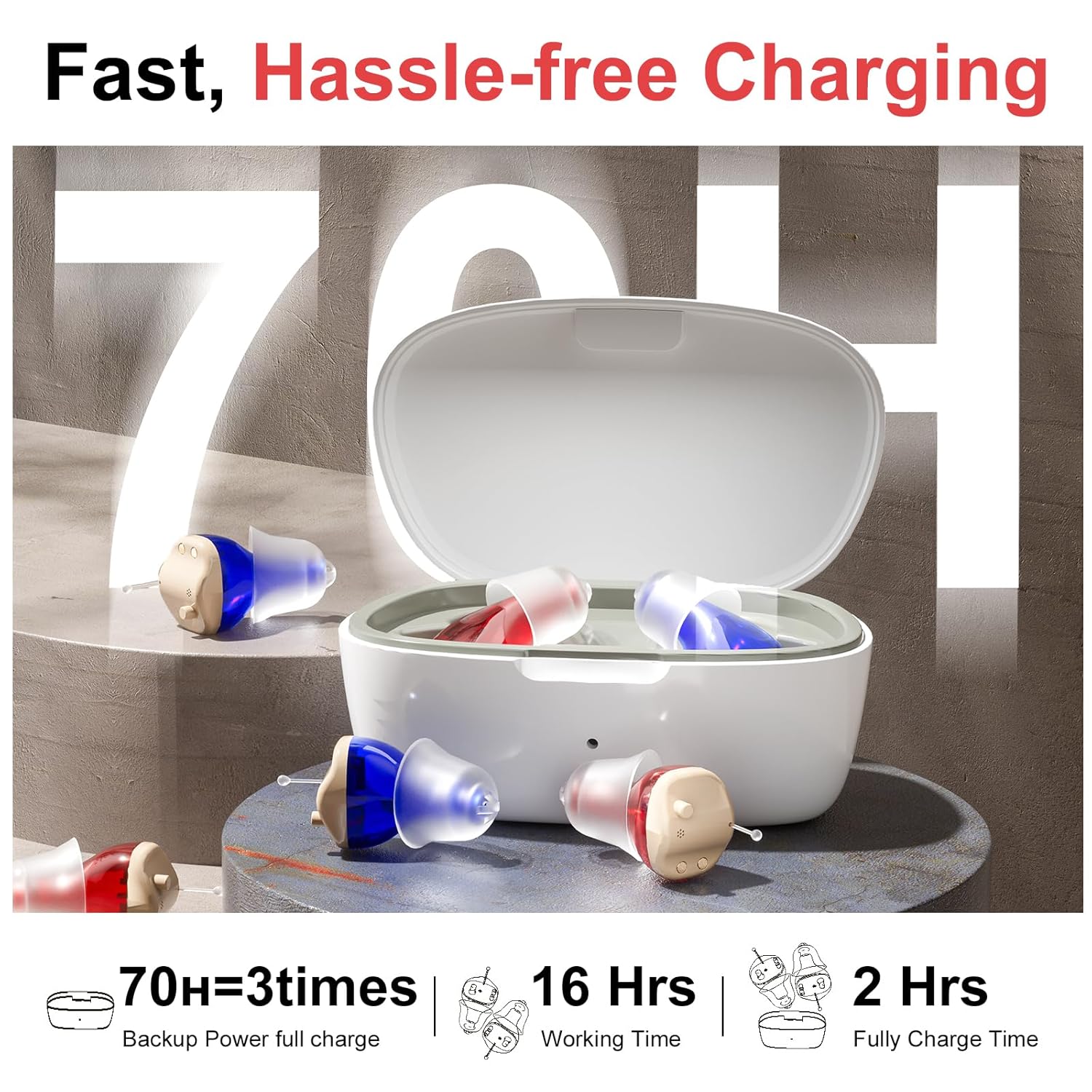 Review: The Hearing Aids for Seniors, Rechargeable with Noise-Canceling and Portable Charging Case is a good, budget-friendly option for seniors with mild to moderate hearing loss. The ease of use, noise-canceling features, and rechargeable design make it a solid choice for those seeking a simple, effective hearing solution. However, it might not be suitable for individuals with more severe hearing impairments or those in need of advanced features. It is a great option for everyday use, offering comfort, convenience, and clear sound amplification at a reasonable price point.