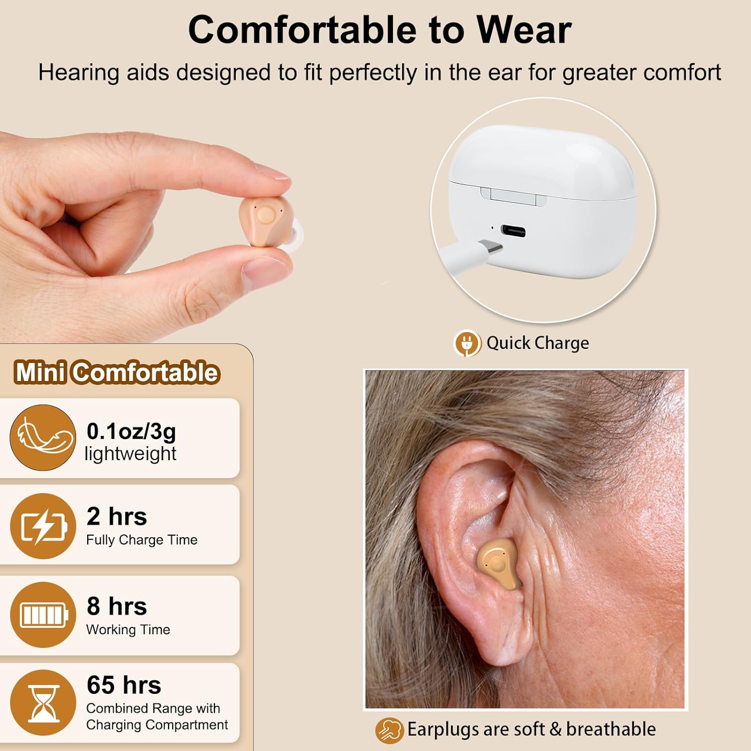 Review: I am very happy with this purchase. I decided to try these hearing aids to enhance my hearing during daily activities. They provide excellent sound quality, making conversations and sounds around me much clearer. The ease of use is remarkable, with intuitive controls that anyone can manage. The rechargeable feature adds to the convenience, saving time and effort compared to traditional battery-operated aids. They fit my ears perfectly, ensuring comfort and a secure fit without any hassle. These hearing aids are comfortable to wear all day, and I hardly notice them after putting them on. Their design and functionality have significantly improved my hearing experience. I am very satisfied with the comfort and sound quality they offer. These hearing aids are truly a great buy, combining convenience, comfort, and excellent sound quality, providing great value for money.