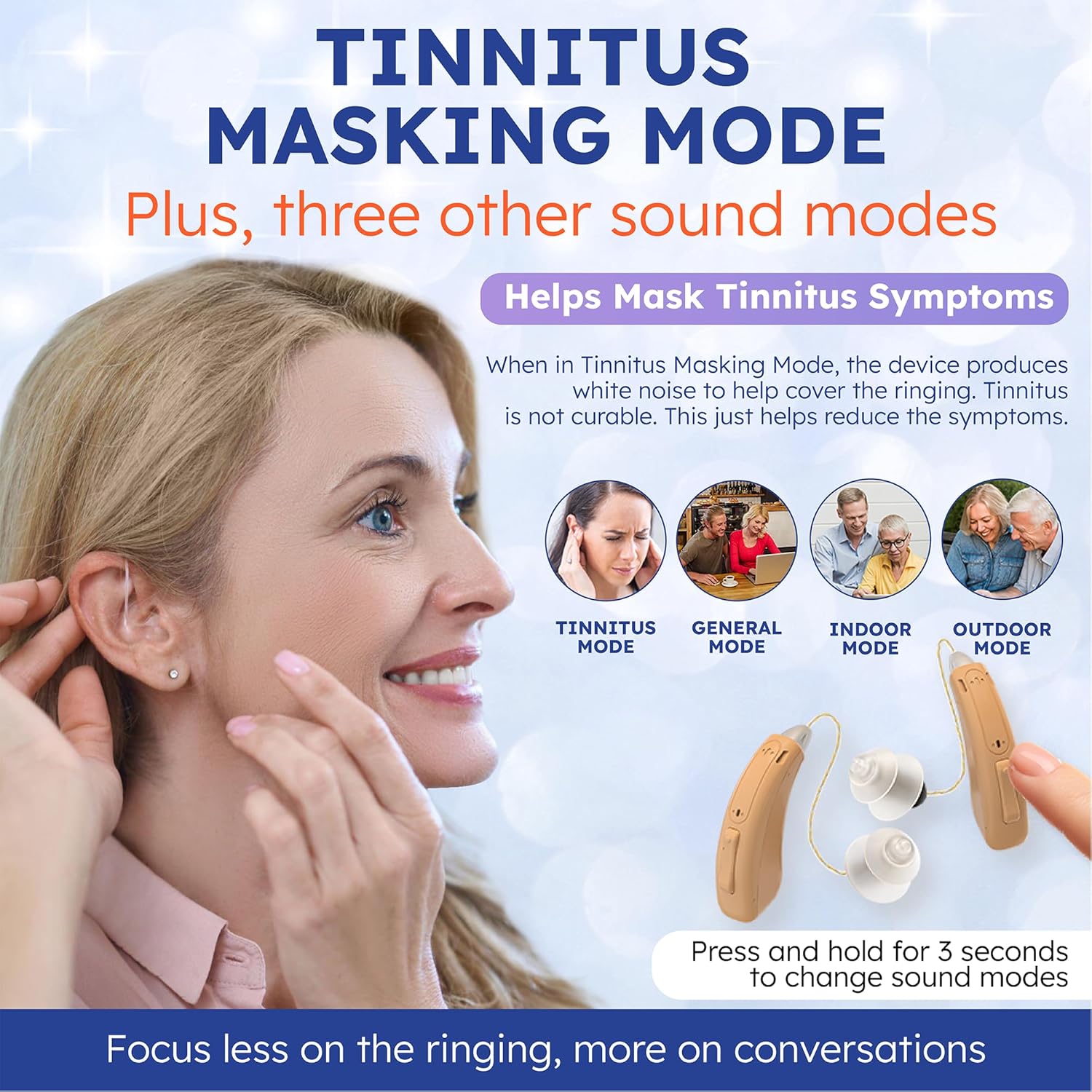 Review: These are the nineth pair of hearing aids I have purchased, all different, and including one pair of expensive aids. These are very good hearing aids. They are the best the of those nine I have purchased. I like the fact that I can customize the operation to fit what I need for hearing. I need a custom frequency response curve, which I can do with these. So far I am using the General mode and that seems to work very well. I started with the frequency response from the hearing test. After that, I told my wife to talk to me and as she did I adjusted the frequency response curve manually. I kept any setting that seemed to help with understanding what she was saying. Nice.I like the automatic turn on when removed from the case and the automatic turn off when returned to the case.I have a few complaints. Any changes are enunciated by voice but the volume of the voice is so low that I can barely hear it, and I can’t understand what she is saying. The volume of that voice is not changed by the normal volume control.The apt for controlling these is a bit funky. It takes a few minutes to say the aids are connected to WIFI, even though they are already connected. It took me a whole month to figure out how to know if the aids are connected to WIFI, or not. When the light in the aids blink, they are connected to WIFI. When wearing the aids, you can’t see that blinking light. The manual does not mention this. Turning off WIFI in the phone disconnects WIFI but then they are not useful for answering phone calls because it takes about 2 minutes to get connected again. This might work for originating phone calls but not for answering them. You only get 5 hours in WIFI mode.In addition to noise reduction, they eliminate feedback. The feedback elimination is not as quick as the old aids I was using. These produce the feedback for about 2 seconds before stopping. That is not a problem. You have to put your hands near the microphone to get feedback or have the earpiece come out of your ear. The volume level of the feedback is not terrible, as with some aids. Selecting the right size dome is essential for stopping the feedback.There are 4 modes of operation, but I haven’t evaluated them yet, other than just quickly cycling thru them. One of those modes is for people with tinnitus. I have tinnitus but I won’t be using it for that purpose. The volume of the white noise so low that I can’t hear it. I wasn’t sure it was really working, so I asked my wife to listen. She said yes it is producing white noise. That doesn’t matter. My tinnitus is not bad enough that I need help for it.Noise suppression is good but not as good as my old aids.Even with the things that don’t work quite right, these hearing aids are very useful for me.