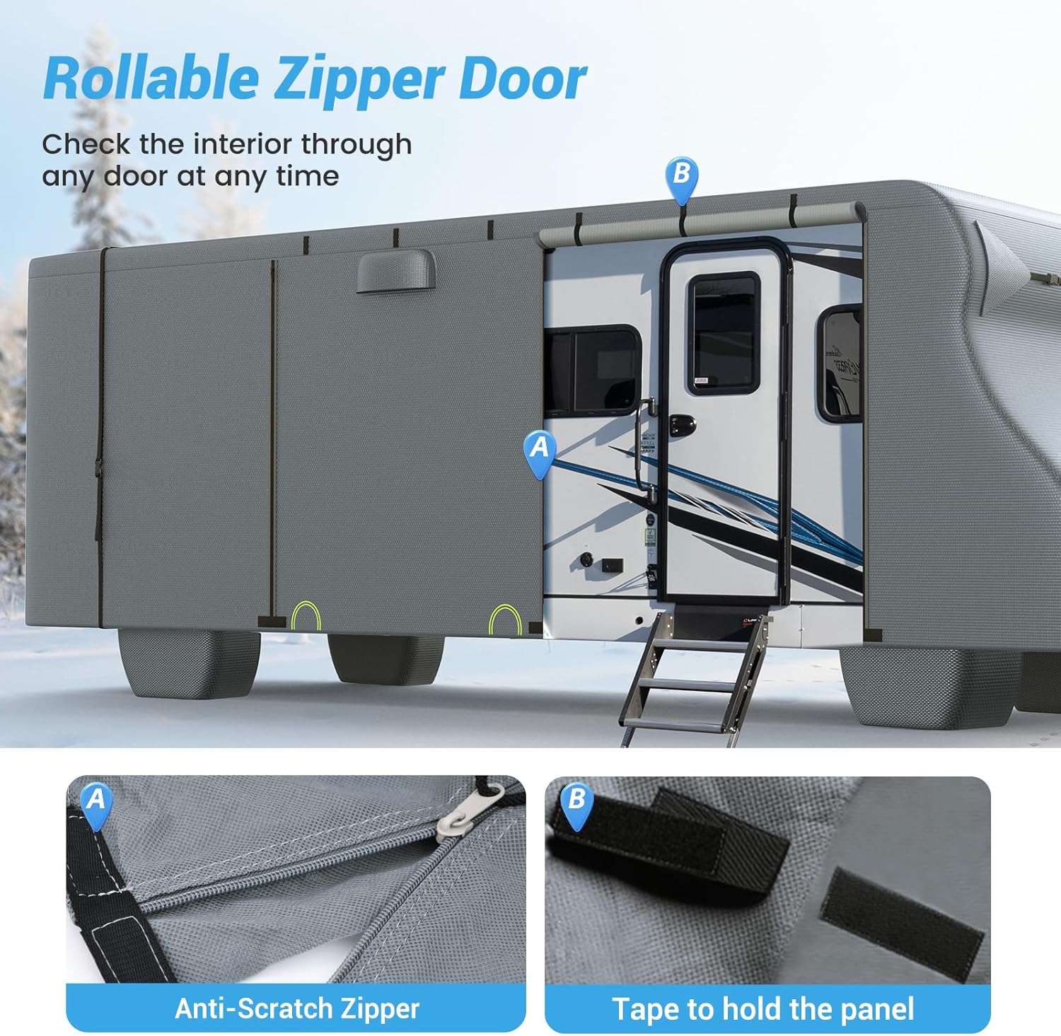 【VENTILATION & ACCESSIBILITY】 The cover features 4 air vents that enhance airflow along the roof line on both sides, balancing the air pressure inside and outside the cover on windy days. The cover also has 3 zippers that make it easy to access the vehicle. Just roll up the zipper panel to check the internal situation anytime, and with the added padding under the zipper, there's no need to worry about scratches on your RV.