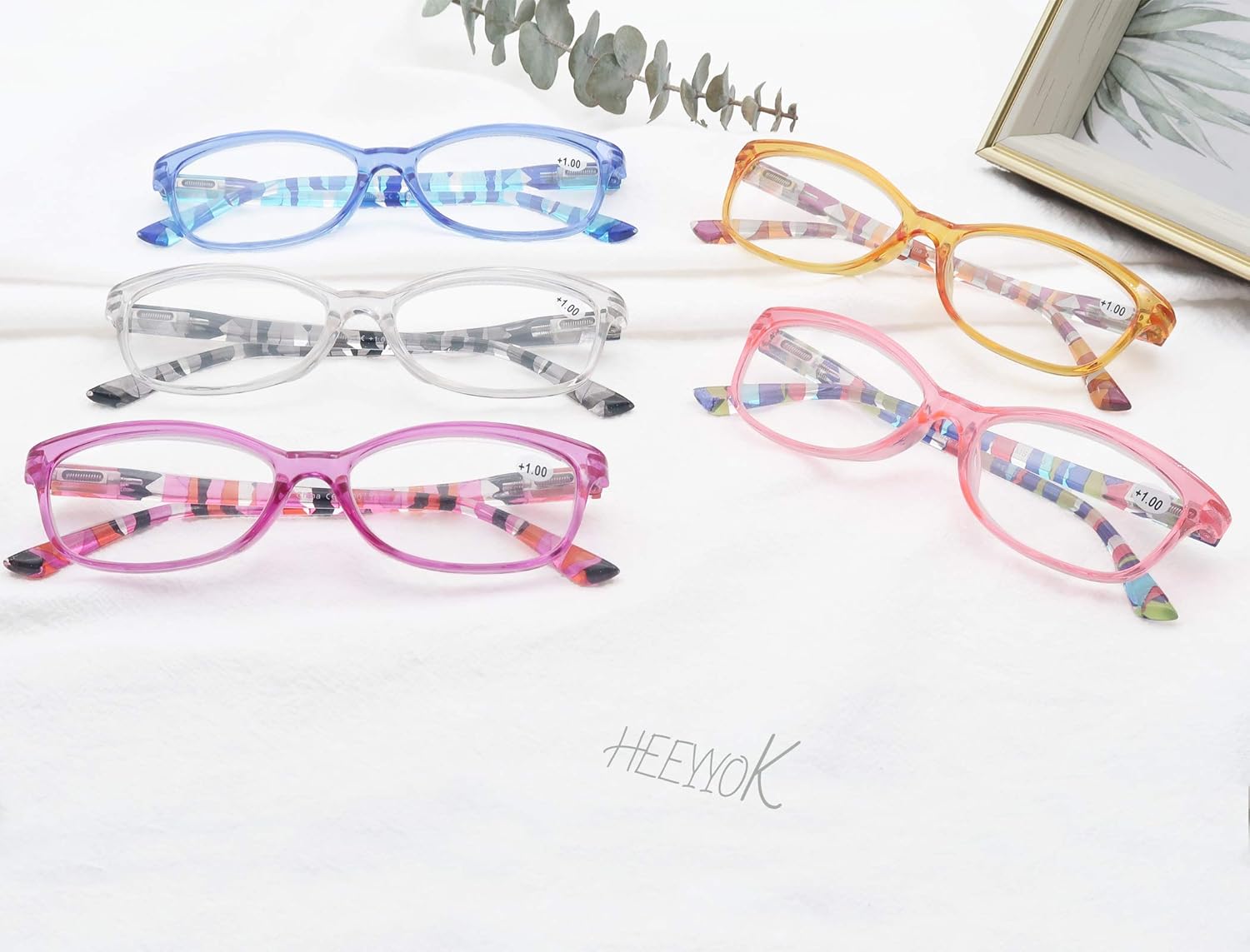 Review: “HEEYYOK Reading Glasses Women Multiple Pack Men’s Readers Including Sun Readers Outdoors”I got mine today and I really like them! They are exactly as depicted in the pictures. The colors are good, especially the tortoise which is not orangey. I would not consider them for most men though. I have a small face and the shape/size are perfect for me. I’ve found it very difficult to find this ‘exact’ lens shape (my favorite) but these are just right. The lens strength is spot on, they are crystal clear, light weight and have the spring arms for comfort. Nice packaging too, and each pair came with it’s own soft sleeve to protect them when carrying or storing. That’s a big plus for me. They also came with a cleaning cloth. I like having a pair around the house and in my car so multiple pairs are great for me. I like the dark readers for outdoor reading too. I’ve been wearing inexpensive readers for years and haven’t seen dark ones very often. I consider them a great value for the money!!