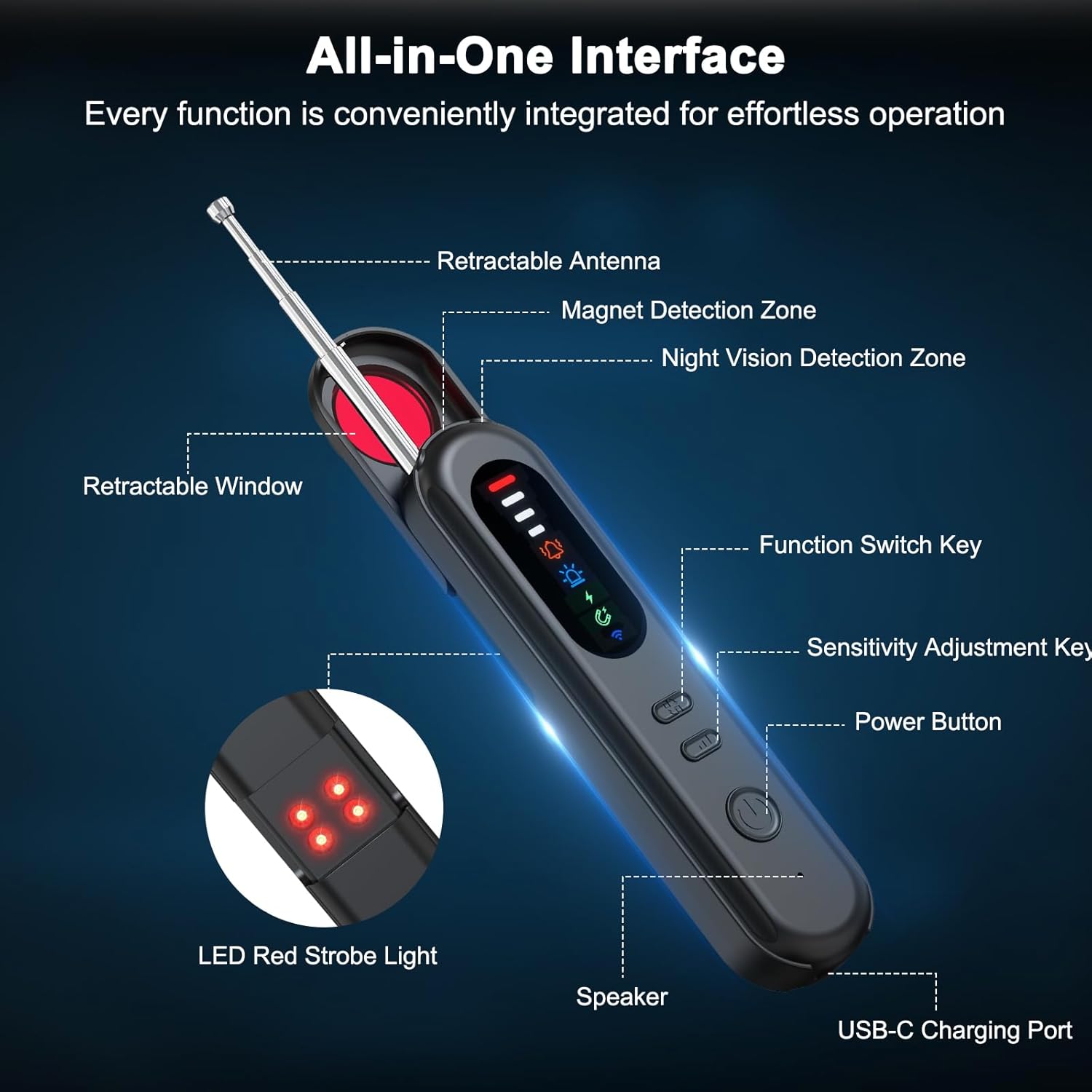 【Universal Device Detector for Every Setting】 Our camera detector spy camera finder combines a listening device detector, camera finder detector, tracker detector, camera scanner detector, and recording device detector—all in one compact unit. The hidden bug and camera detector can safeguard your home and office, ensur privacy in hotels and rental properties, protect your vehicle from unauthorized tracking, or securing sensitive discussions in public spaces.