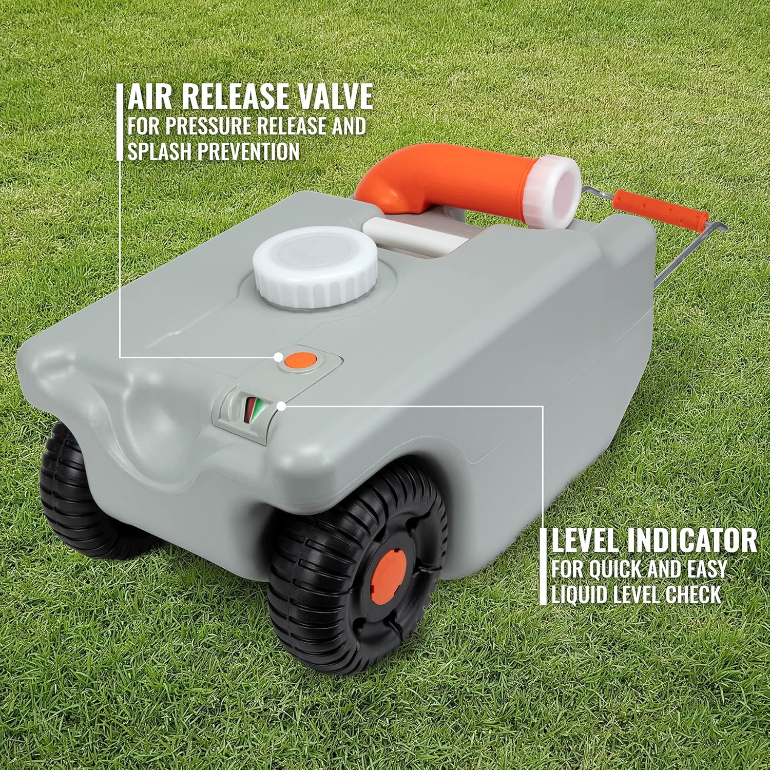 The Hike Crew RV 6 gallon black water tank offers a convenient solution for camping adventures. Ideal for longer RV trips when no disposal station is nearby. The generous 3.1-inch fill opening allows for quick waste water transfer, while the extra-large M60 drain opening with an adjustable 9-inch rotary tube ensures effortless, clean disposal at approved sites or in a septic tank. The built-in bleed valve allows pressure equalization, prevents messy splashes and keeps the transfer process clean. An integrated water level indicator helps to monitor current tank capacity and avoid overfilling. The easy to clean parts ensure hygienic use. The durable plastic container with 7 inch wheels provides stability for camping in various conditions.