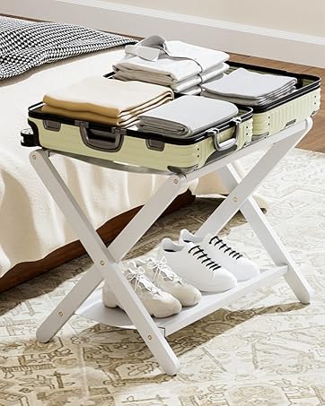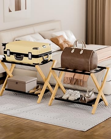 STURDY AND STABLE - Made of solid bamboo frame and X-shaped stabilizing structure that prevent swaying to ensure the luggage holder stays in place during use. It can support up to 110lbs on the top and 21lbs on the lower shelf