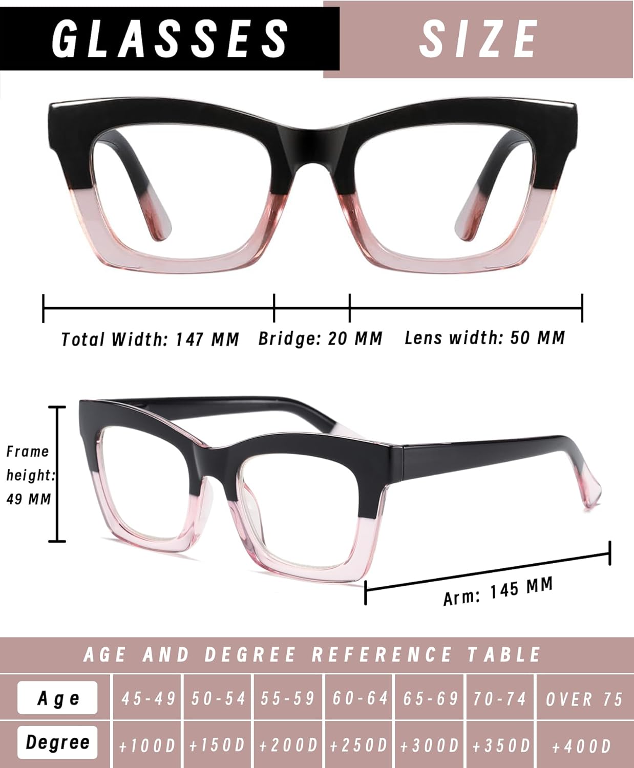 Review: I finally accepted I’m old, my vision sucks, and I need reading glasses. My nose is always in a book, has been since I was 4 years old. So, I went to the dollar store and purchased a couple basic pairs. And now I’m sold on reading glasses and I pretty much use them for everything. Why strain my eyes unnecessarily?Since becoming a reading glasses convert, I decided I needed something more stylish and functional. I probably went through 10 pages of glasses on Amazon. This pair stuck out to me for the price, style, and functionality. I don’t need 20 pairs of reading glasses for $10. I wanted a sturdy, stylish pair of glasses or two. And these ticked off all the requirements. They look good and they’re not super expensive.They are sort of retro meets modern in style. Honestly, I really wanted the emerald green glasses and the black ones were just a bonus. And I really love the green ones. I wear them most of the time. They are a beautiful shade of translucent emerald green. They are pretty dark but stand out in the sunlight or bright lights. But, I have received compliments while wearing both colors. Because I use them mostly for reading, I have not had a chance to notice the effect on blue light. But I appreciate that these reading glasses offer that too.The frames are large and thoroughly cover both eyes. They are not too heavy, or at least I have not noticed them to be so. They don’t slip down the bridge of my nose nor do they squeeze my temples, which I have noticed other glasses do.Because I love these so much, I will probably not need to buy anymore reading glasses for a long time unless I get bored with the color and style, which I doubt.