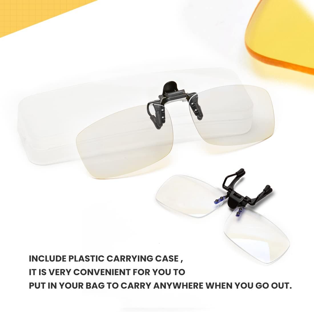 Review: Working from home, I discovered an issue that I didn’t really pay much attention to before. I have trouble seeing my computer monitor when I’m wearing my glasses – bifocals. I can see well enough from the bottom of the lenses, but that’s not tenable for 8+ hours a day. I needed to find something else.I briefly tried putting reading glasses over my regular glasses, just so that I could see. Not very comfortable for very long. So I thought I’d see if there was any such thing as clip-on magnifiers. Lo and behold, there are.Because of where the clip is, I was a little hesitant. I have a pretty strong prescription, which usually means my glasses are pretty heavy. Having something balanced right over top of your nose for even 10 minutes, when your glasses are already heavy, is extremely uncomfortable. But I saw the reviews saying it they were light, so I thought I’d give them a try.I’ve been using them for a few weeks now, and I must say that I’m quite happy with my purchase. The fact that I can flip them up and down is a good benefit as well. When I don’t need them, I can flip them up out of the way, or I can take them off. Flipping them up halfway does create a balance disparity, so they do tend to feel heavier that way. If I flip them all the way up, though, it just feels the same as when they’re all the way down.Even though these are lighter than other similar clip-ons I’ve worn (sunglasses), they do add weight, so if you have sinus issues, your glasses are particularly heavy, or you’re just sensitive, these may not work for you. I have a fairly strong prescription, and up until my current pair, my glasses are always on the heavy side. I don’t think I would have been able to use these for long with any of my previous glasses.The lenses have a slight yellow tint, which blocks the blue light from the monitor and reduces eye strain. It’s also a lot easier to get to sleep after spending an entire day staring at my monitor.Overall, these are doing exactly what I hoped they would. Good purchase.