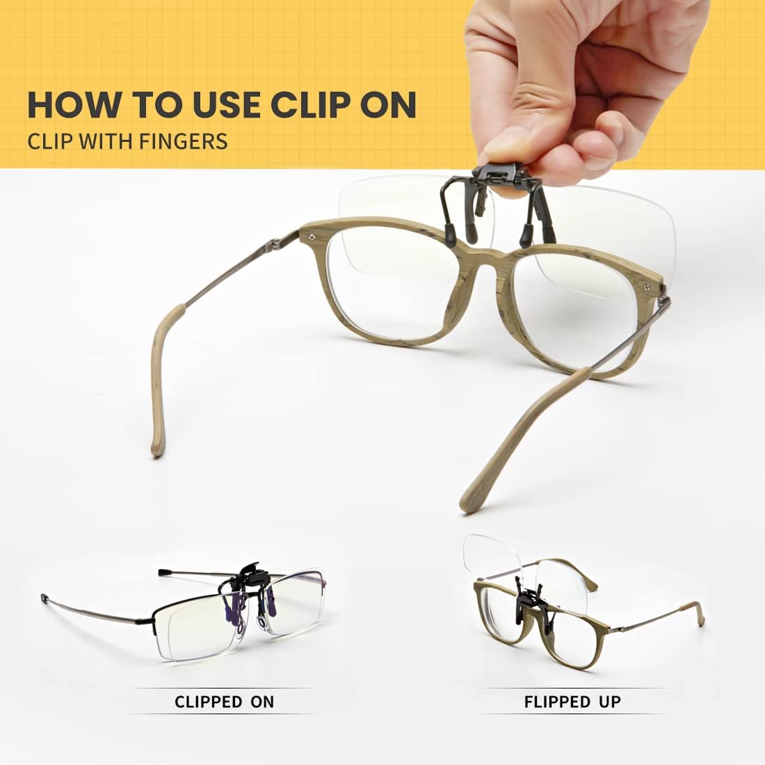 Review: These clip-ons work great and were exactly what I needed. I even bought them twice. They are a little bulky and the extra heft sometimes causes my glasses to slide down my nose. But I can live with that. The real issue is the durability of the clip, itself. On two pairs of these, the clip has broken within a month or two. Broken maybe isn’t the right word. The pieces pop apart. I was able to snap them back together, but in both cases, the readers were never the same. Once they come apart they start a cycle of coming apart more and more often. It just becomes too annoying. I am now looking for a pair that don’t flip up so they don’t have these fragile clips.