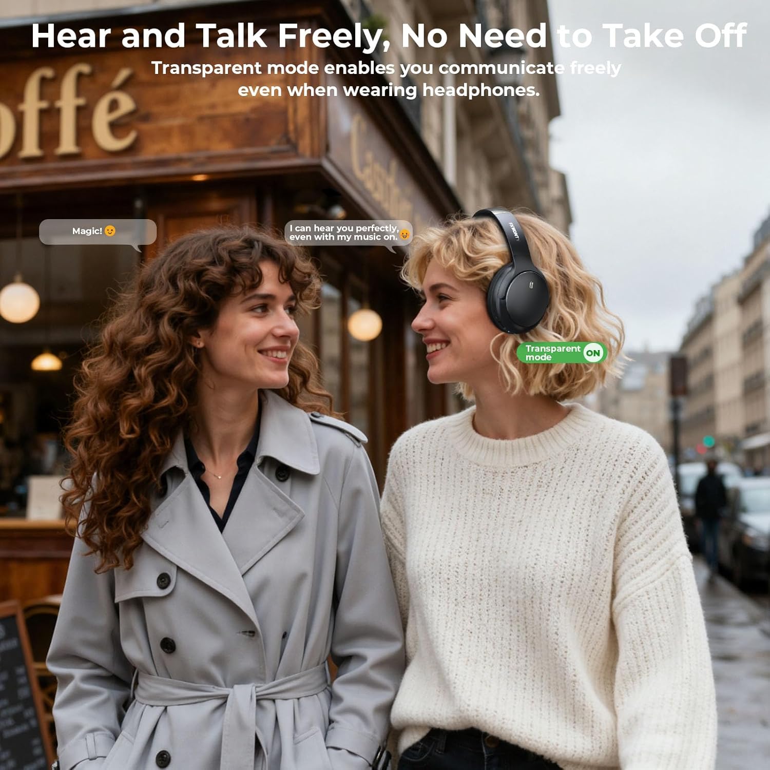 Review: These noise-cancelling headphones exceeded my expectations in just about every way. The hybrid ANC is surprisingly powerful— it cuts out up to almost all of my background noises. Airplane engines, subway rumbles, office chatter… all of it fades away, making it easy to focus on music, movies, or work. It creates a calm, distraction-free environment no matter where I am.The sound quality is just as impressive. These headphones deliver deep bass and high treble ranges, giving everything from podcasts to playlists a rich, high-definition feel. Transparency Mode is also extremely handy—one tap and I can hear announcements or have a quick conversation without taking the headphones off.Battery life is another huge plus. With ANC on, I easily get over a full day of listening, and with ANC off, the 70-hour rating feels endless. Even better, a quick 10-minute charge gives me about 10 more hours of use, which has already saved me a couple of times on busy days.Connectivity is smooth and reliable. Bluetooth 5.4 pairs quickly with my phone and laptop, and the dual-device feature makes switching between work and personal use effortless. Having the option to use the 3.5mm cable on flights or with older devices is a nice bonus too.Comfort-wise, these are excellent. The memory-foam earcups and soft headband make them comfortable for long sessions, and at just over half a pound, they never feel heavy. The foldable design and sturdy carrying case make them perfect for travel.Overall, these headphones deliver fantastic noise cancellation, sound quality, comfort, and battery life—all at a great price. Highly recommended for travel, work, or everyday listening!