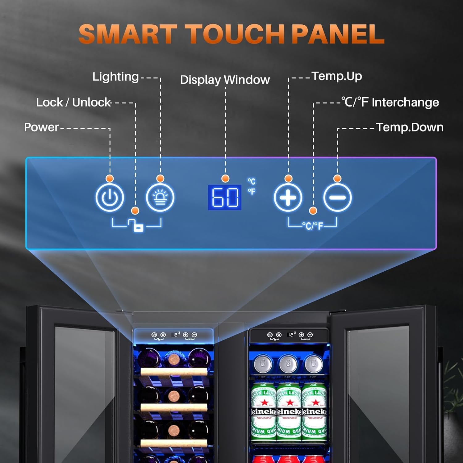 User-Friendly Touchscreen & LED Lighting - The sleek touchscreen interface makes it easy to adjust settings and monitor temperatures at a glance. The wine and beverage cooler also features elegant LED lighting that showcases your collection while providing visibility in low light conditions.Its sophisticated black metal frame adds a touch of luxury to any space, elevating the cooler's high-end appearance and complementing modern interiors.