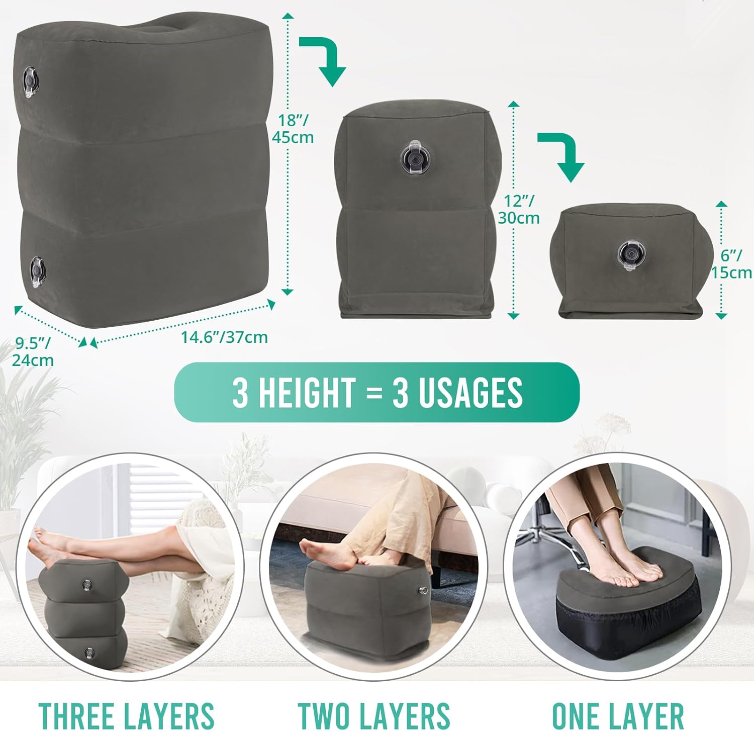 Easy & Fast to Inflate: Our inflatable travel foot rest pillow comes with 2-in-1 double valves. Blowing it up with mouth is much faster than using a manual pump, also it takes away the hassle of bringing a pump and making noise in flight. It usually takes about one or half minutes with a few breathes. And only 3-5 seconds to deflate