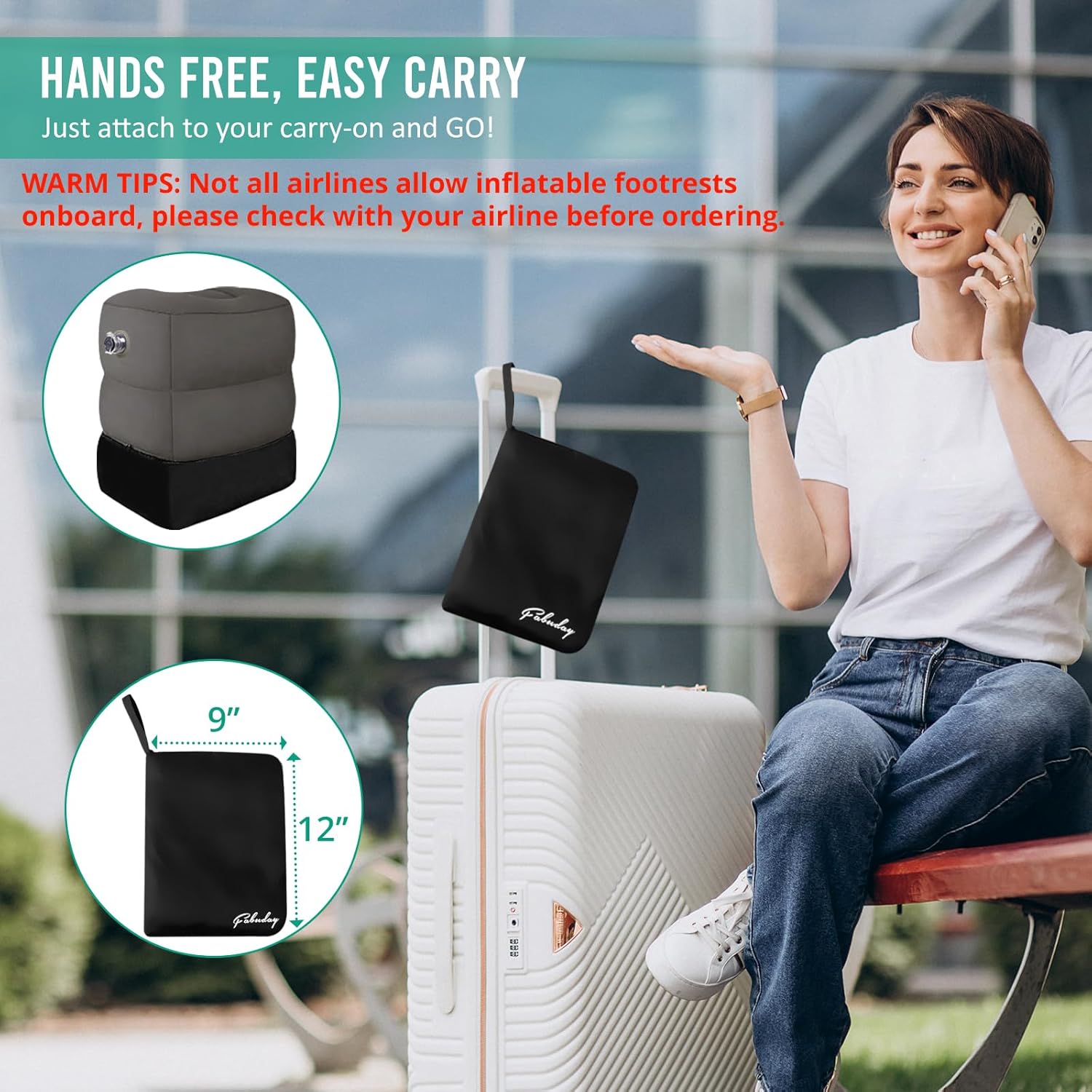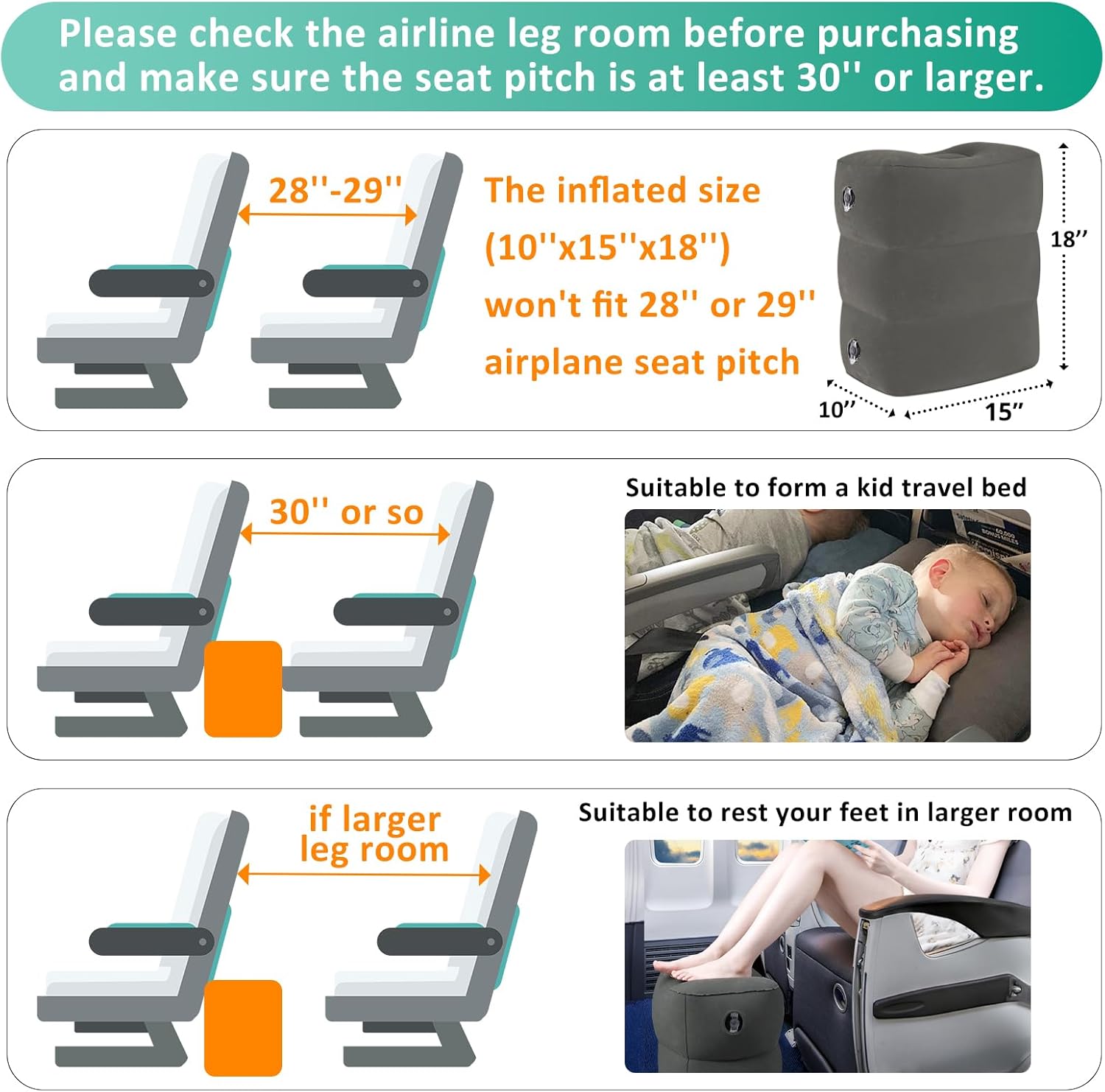 Warm Tips When Use in AIRPLANE: We recommend that you check with the airline in advance before flying, as some airlines do not allow to use this product. Additionally, the inflated size of this footrest (10''x15''x18'') won't fit a 28-inch airplane seat pitch. Please check the legroom on your flight before purchasing and use this footrest when the seat pitch is at least 30'' or larger